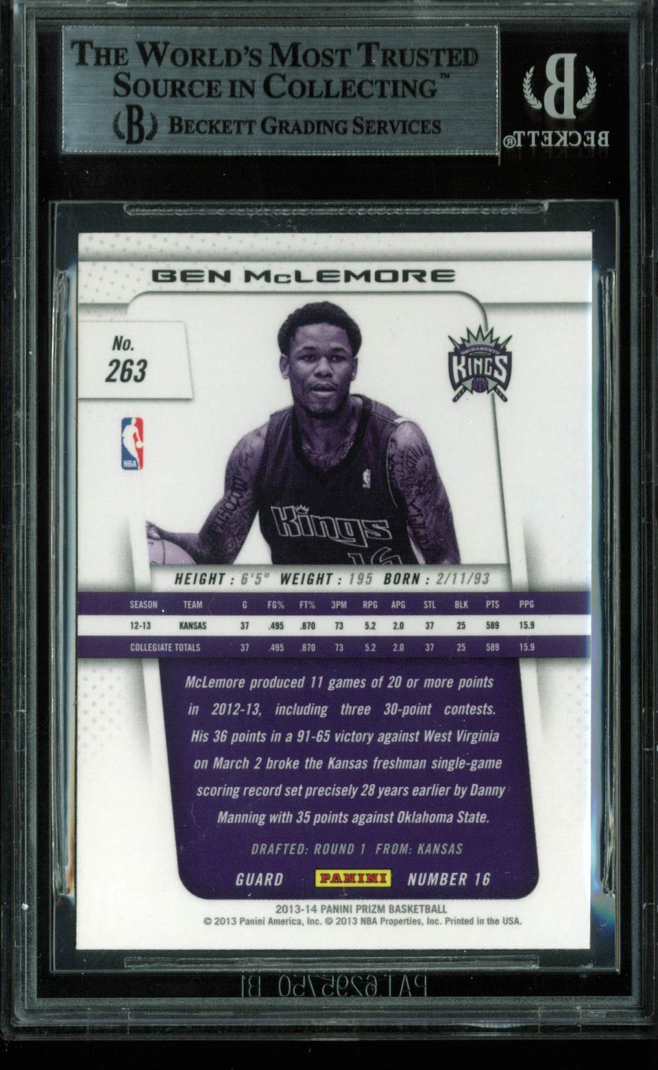 This is a 2013 Panini Prizm RC #263 Authentic Signed Card that has been Personally Signed & Autographed by Ben Mclemore of the Sacramento Kings. This item is 100% Authentc , it comes slabbed and authenticated by Beckett Authentication Services. You can also see the authentication on the Beckett Authentication Services website, beckett-authentication.com. Press Pass Collectibles offers a 100% Lifetime Guarantee on all Autographed & Signed Ben Mclemore memorabilia.