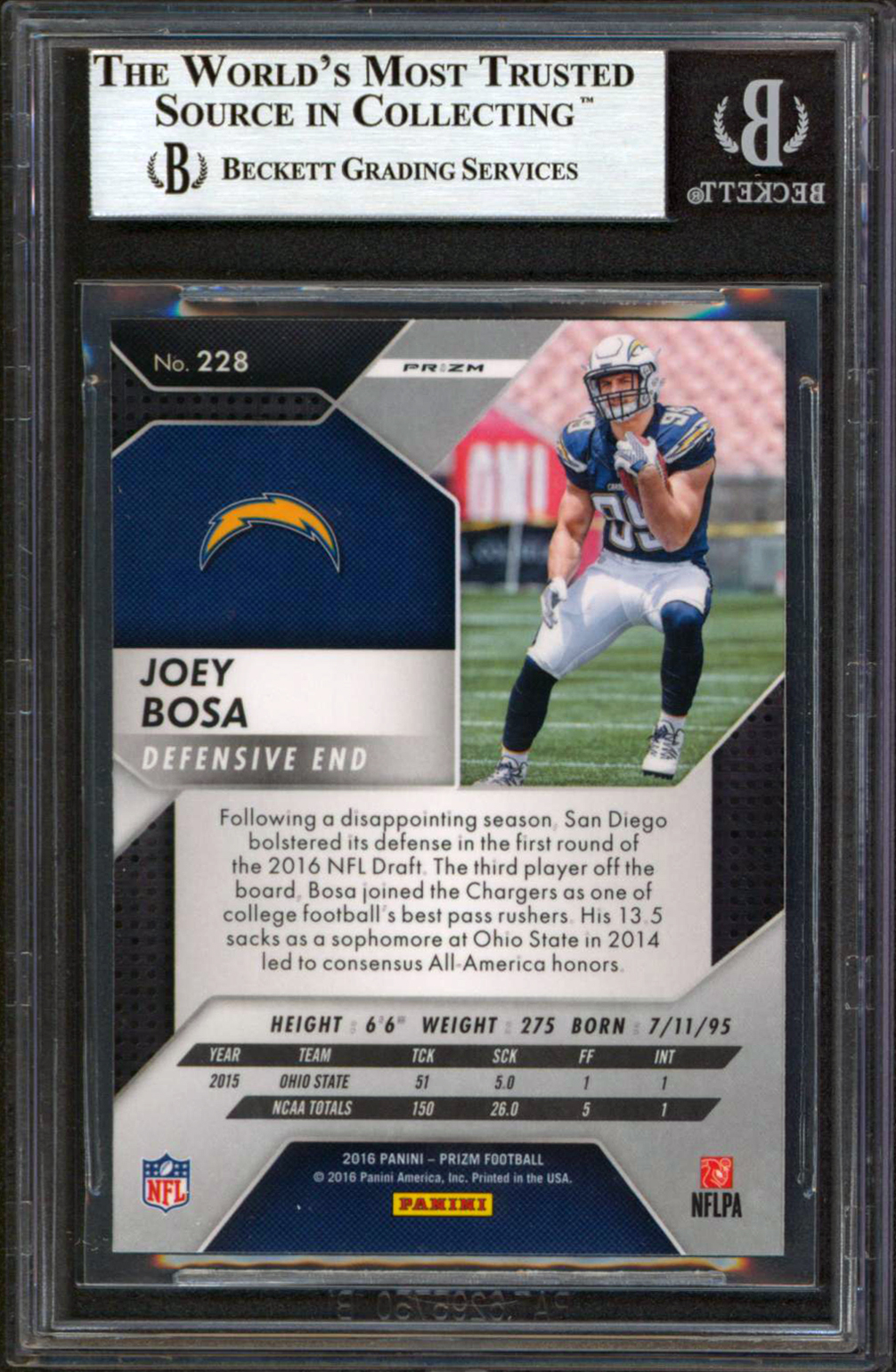 This Autographed 2016 Panini Prizm #228 Rookie Card has been Personally Signed by Joey Bosa of the Los Angeles Chargers. This item is 100% Authentic, it comes slabbed and authenticated by Beckett Authentication Services. The authenticity can be verified on Beckett Authentication Services website.