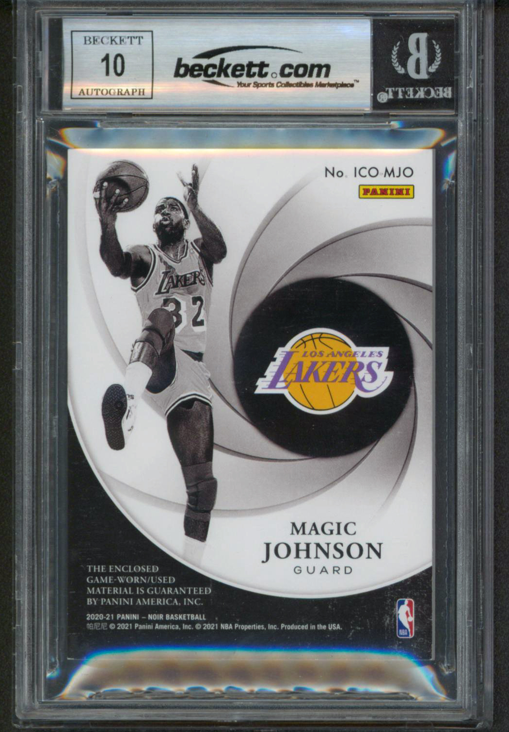 This Autographed Auto Graded Gem Mint 10! 2020 Panini Noir Icons Memorabilia #2 23/99 Card has been Personally Signed by Magic Johnson of the Los Angeles Lakers. This item is 100% Authentic, it comes slabbed and authenticated by Beckett Authentication Services. The authenticity can be verified on Beckett Authentication Services website.