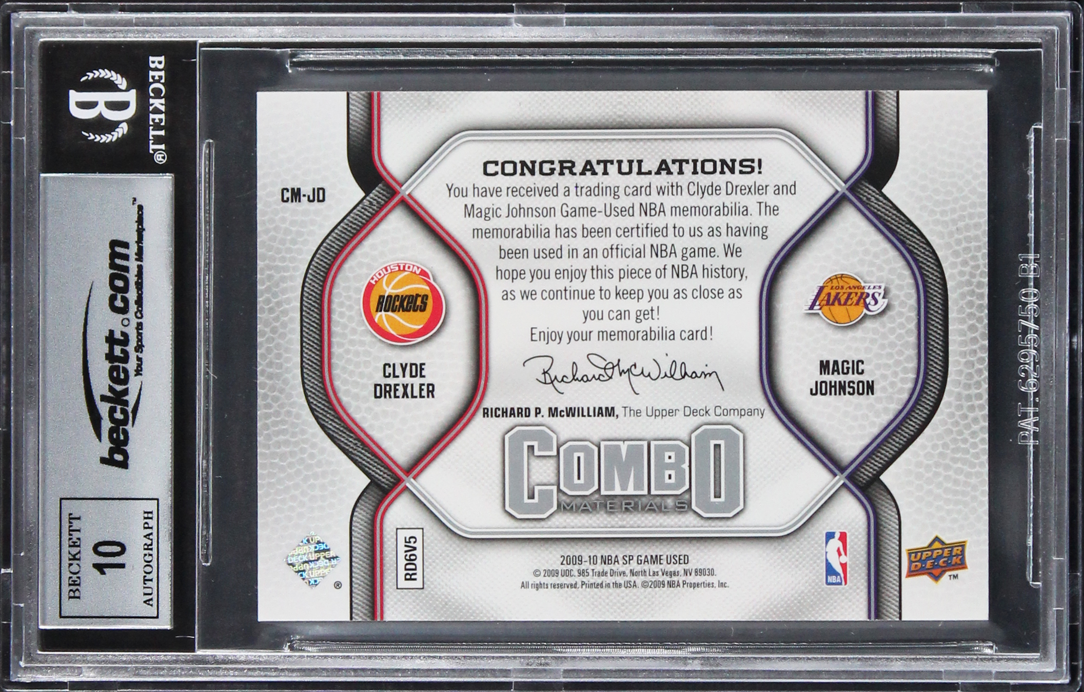 This Autographed Auto Graded Gem Mint 10! 2009 SP Game Used Edition Combo Materials #CMJD 23/499 Card has been Personally Signed by Magic Johnson & Clyde Drexler. This item is 100% Authentic, it comes slabbed and authenticated by Beckett Authentication Services. The authenticity can be verified on Beckett Authentication Services website.