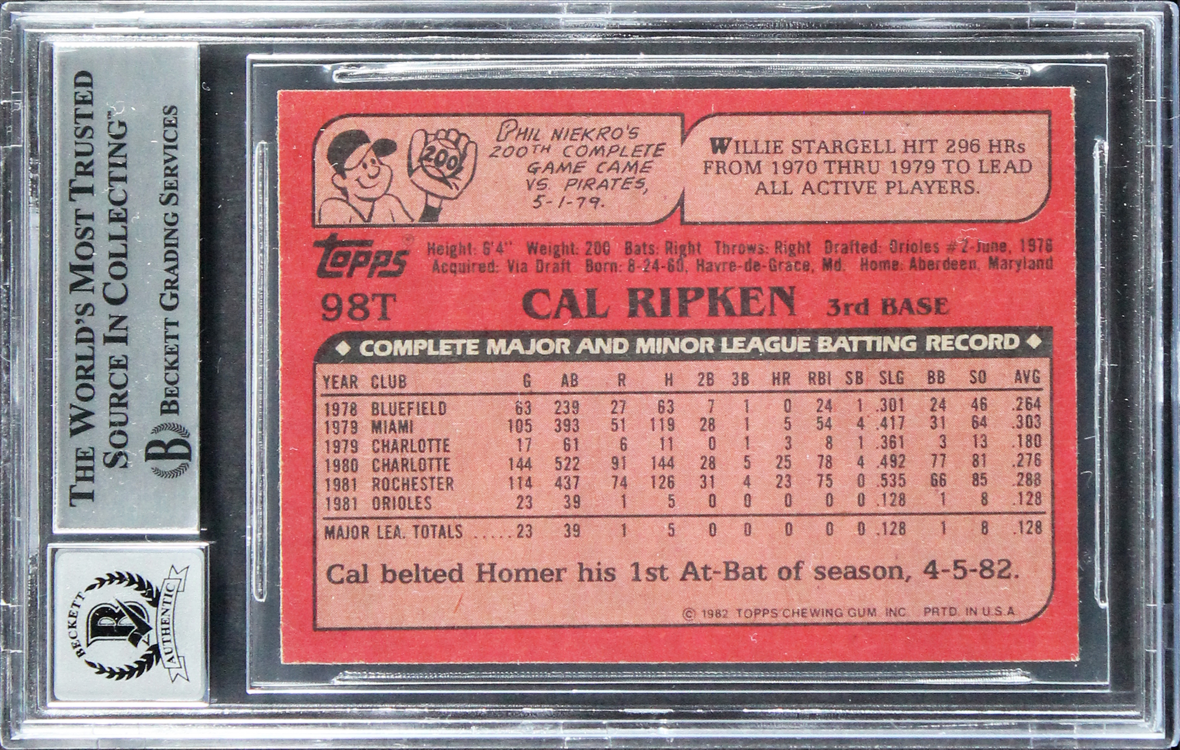 This Autographed Auto Graded Gem Mint 10! 1982 Topps Traded #98T Rookie Card has been Personally Signed by Cal Ripken Jr. of the Baltimore Orioles. This item is 100% Authentic, it comes slabbed and authenticated by Beckett Authentication Services. We conducted an autograph signing with Cal Ripken Jr. where multiples of the same item were signed. While the photographs are representative of this item, the size, placement and strength of the signature may vary. Each item is hand signed, therefore, each autograph is unique. This item can be verified through BAS Slabbed.