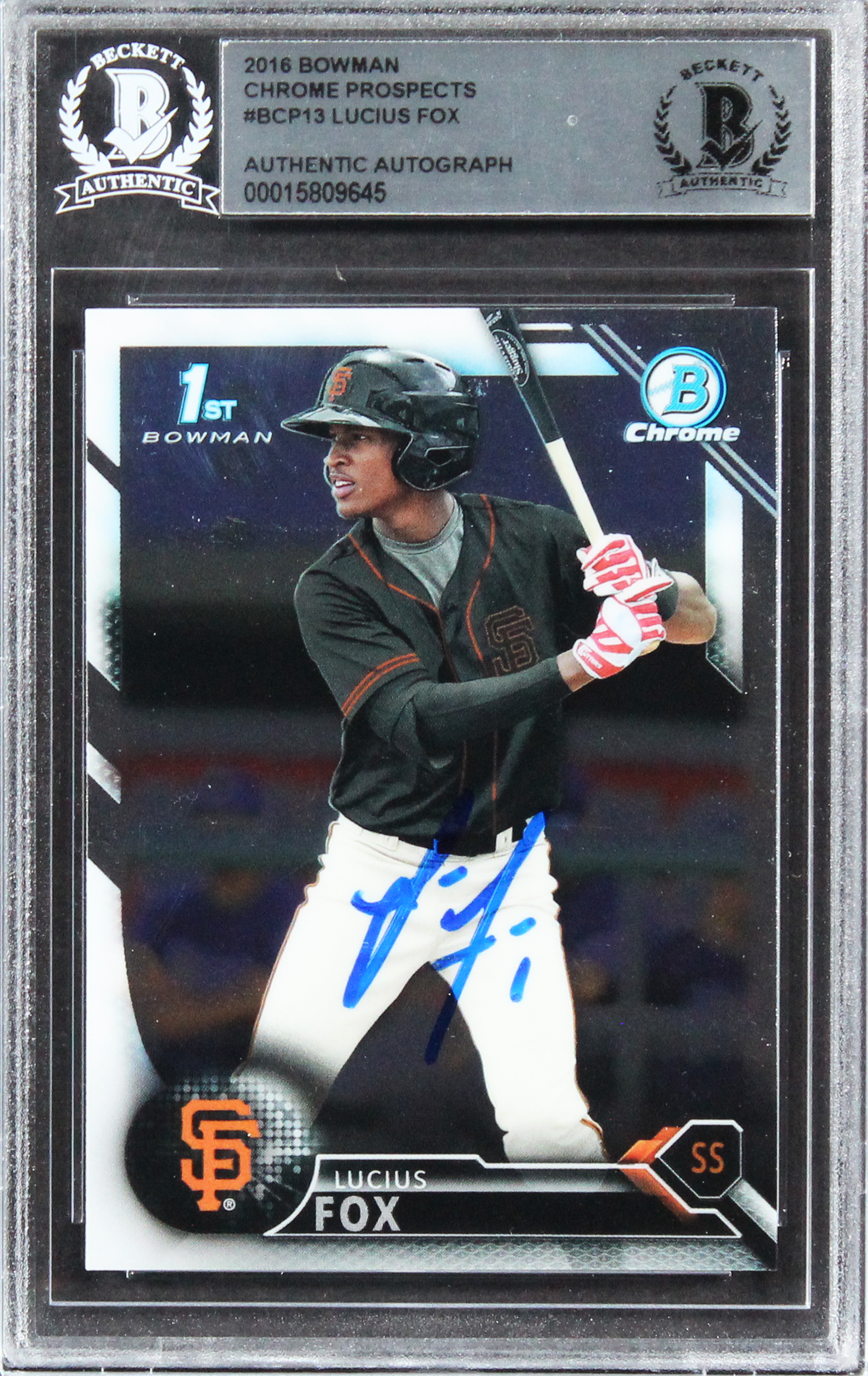 This Autographed 2016 Bowman Chrome Prospects #BCP13 Card has been Personally Signed by Lucius Fox of the San Francisco Giants. This item is 100% Authentic, it comes slabbed and authenticated by Beckett Authentication Services. The authenticity can be verified on Beckett Authentication Services website.