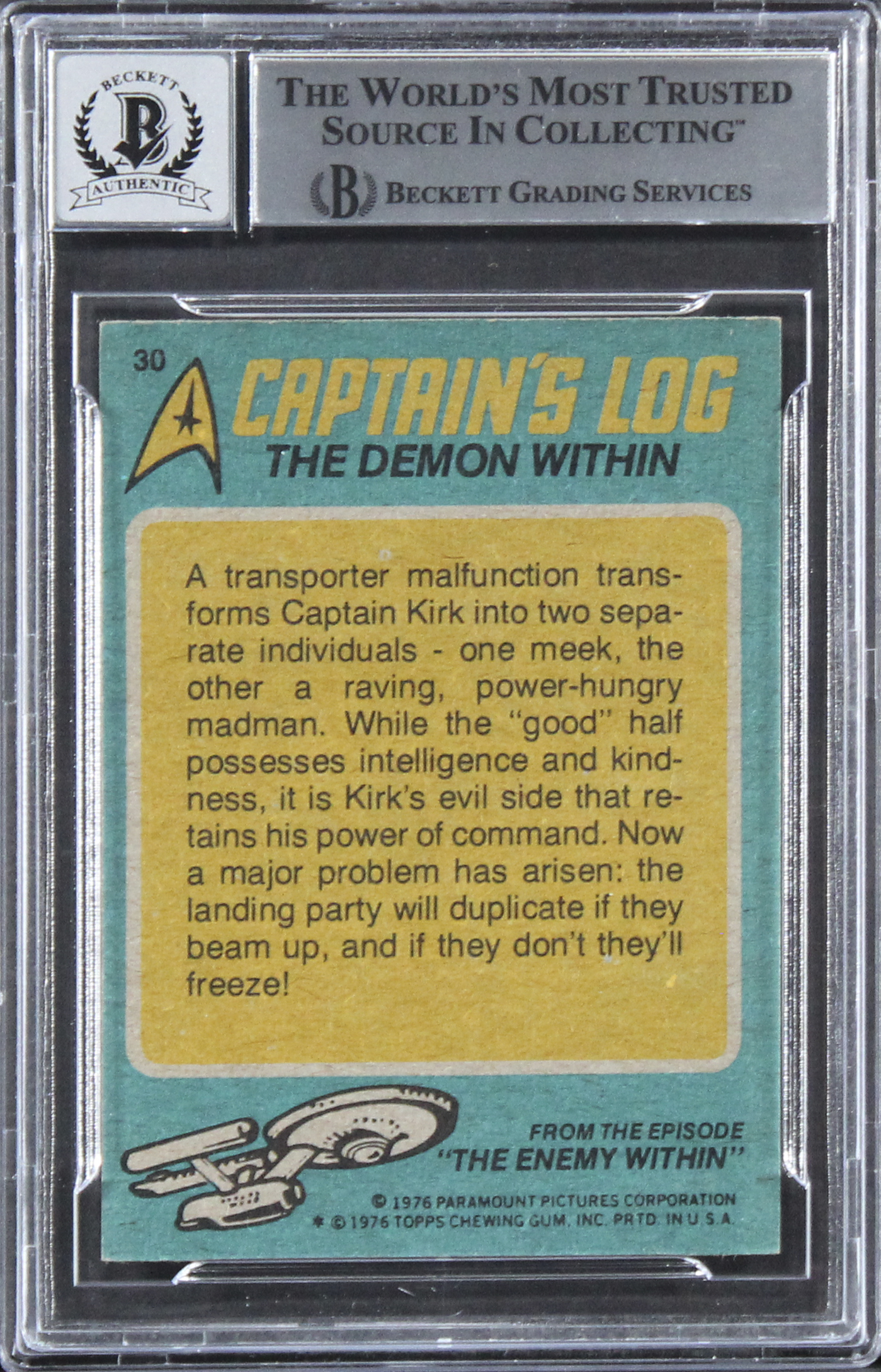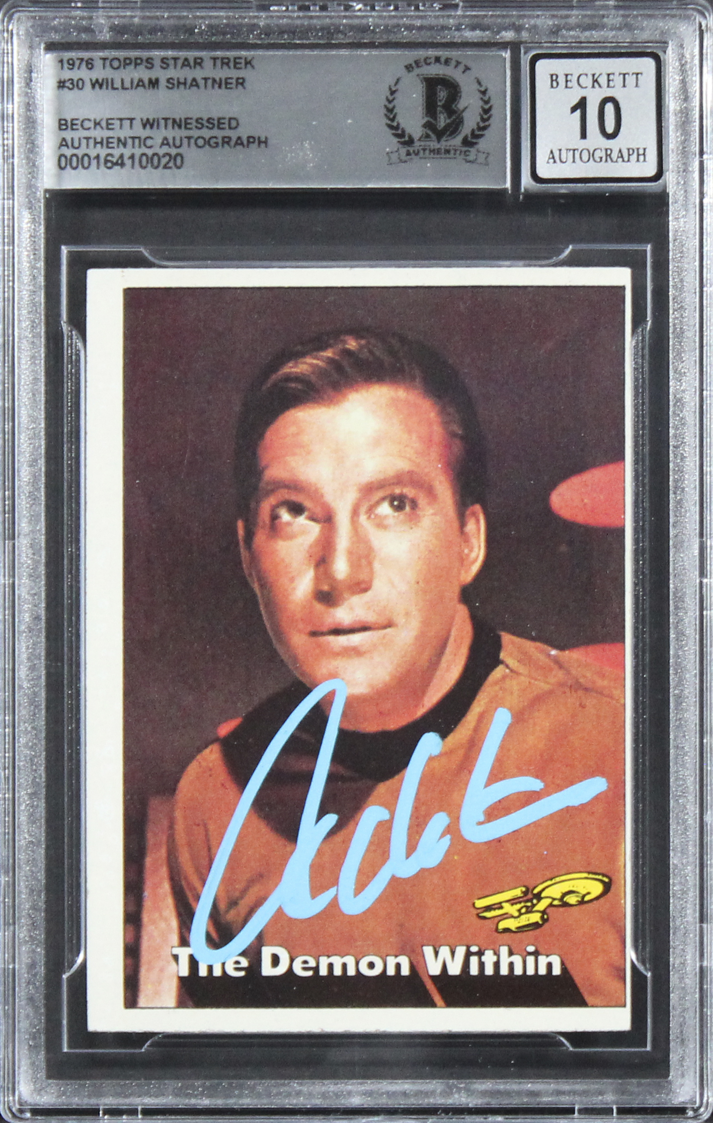This Autographed Auto Graded Gem Mint 10! Card has been Personally Signed by William Shatner of Star Trek. This item is 100% Authentic, it comes slabbed and authenticated by Beckett Authentication Services. The authenticity can be verified on Beckett Authentication Services website.