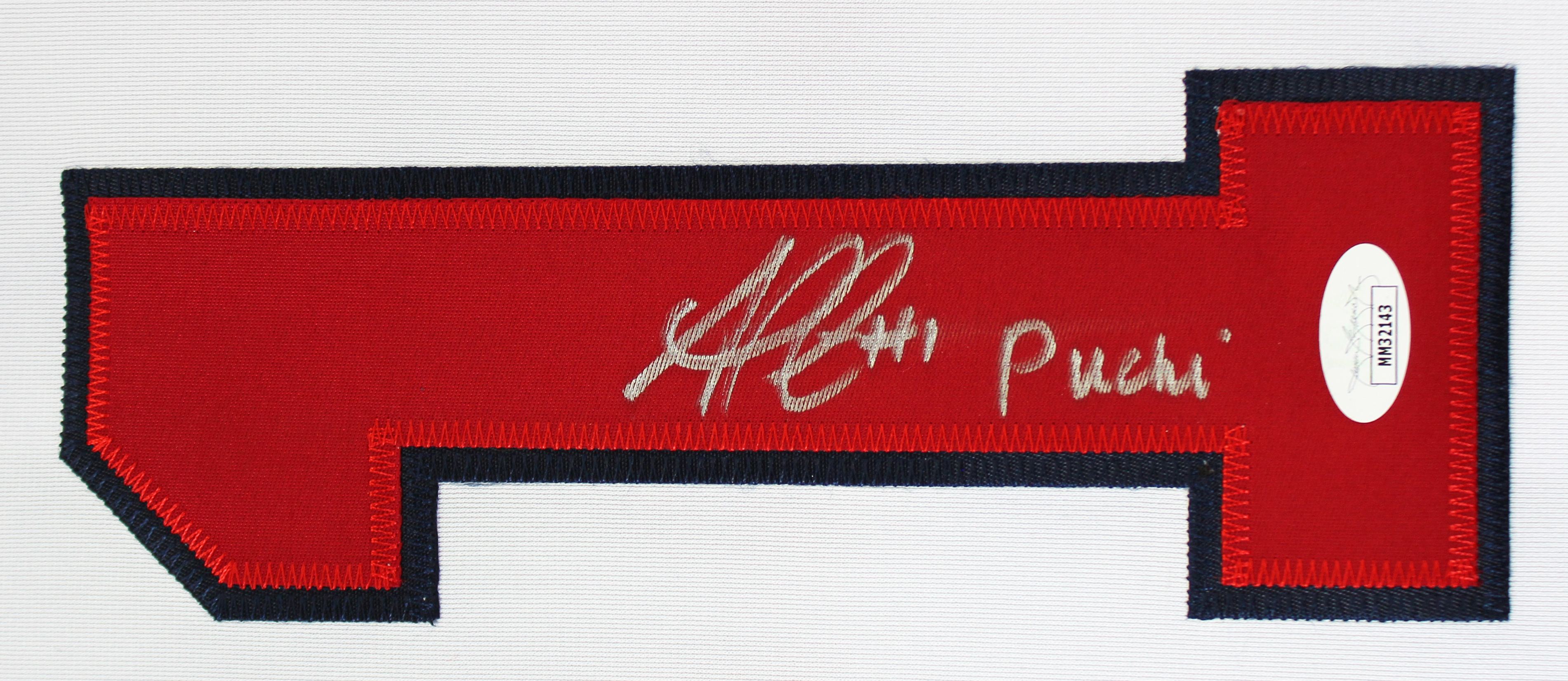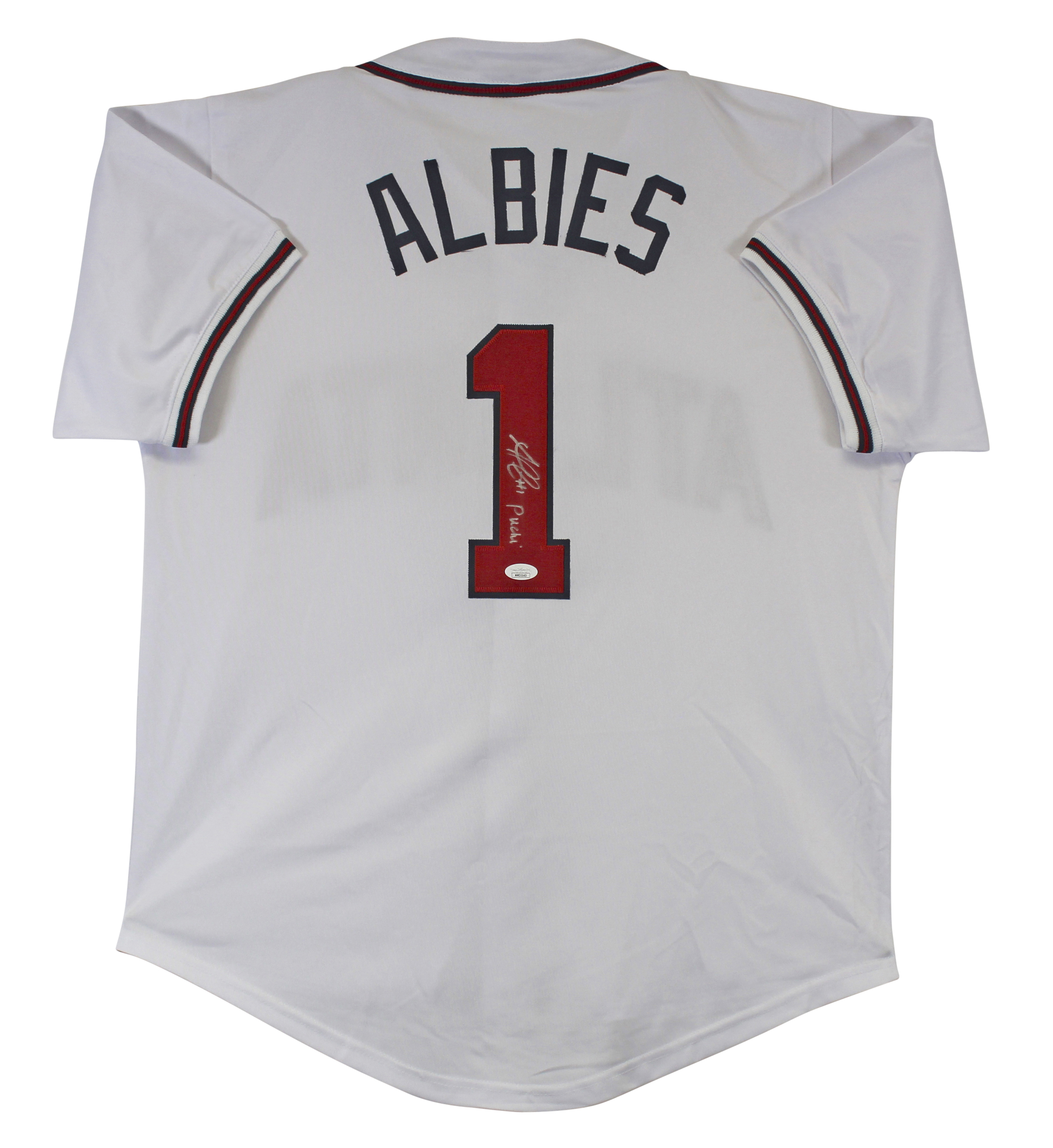This Autographed White Pro Style Jersey with the inscription of "Puchi" has been Personally Signed by Ozzie Albies of the Atlanta Braves. This item is 100% Authentic to include a Certificate of Authenticity (COA) / hologram by JSA. We conducted an autograph signing with Ozzie Albies where multiples of the same item were signed. While the photographs are representative of this item, the size, placement and strength of the signature may vary. Each item is hand signed, therefore, each autograph is unique. This item can be verified through JSA. This is a X-Large sized, non-branded, custom-stitched Jersey.