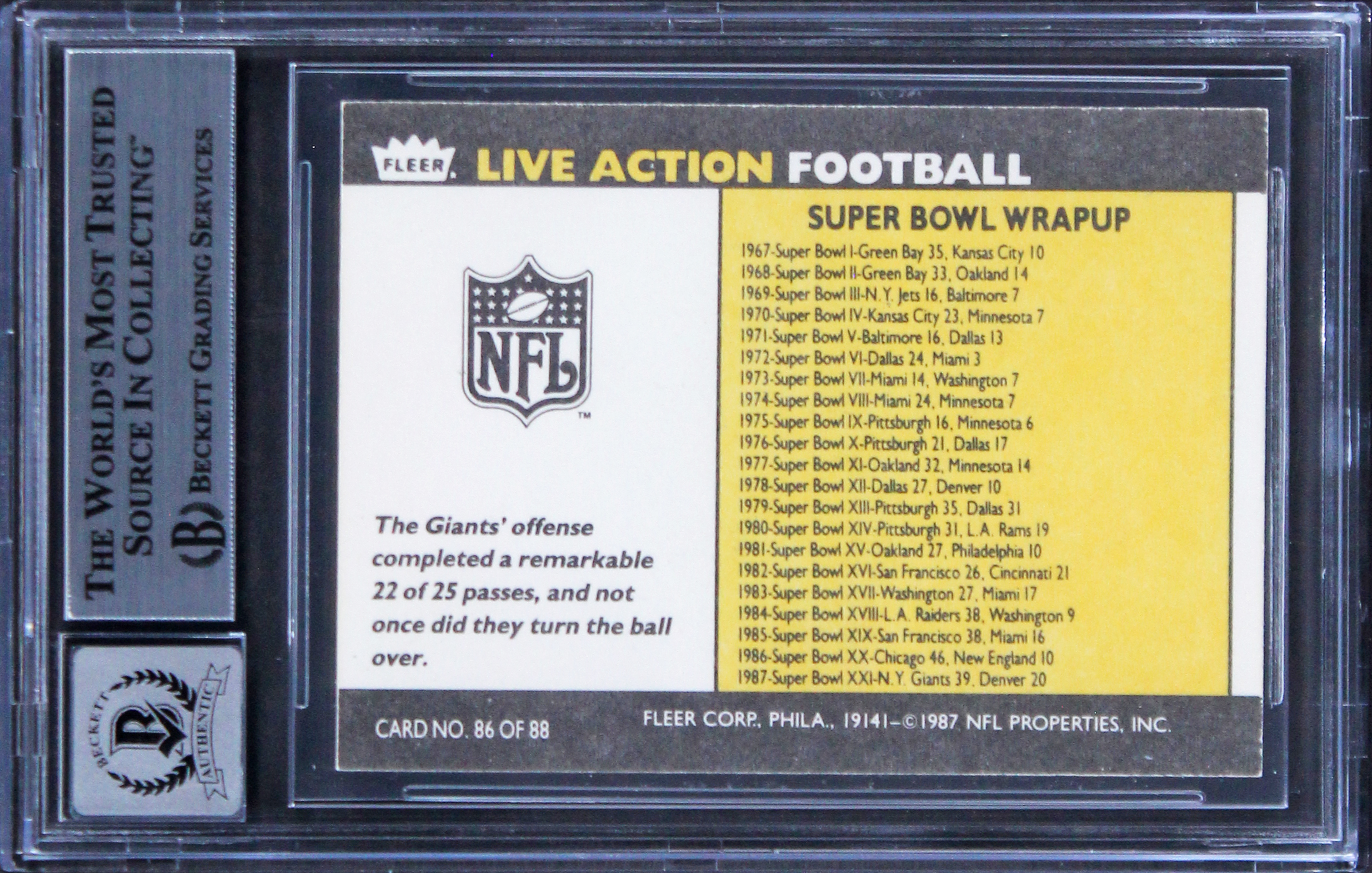 This Autographed Auto Graded Gem Mint 10! 1987 Fleer Team Action #86 Card has been Personally Signed by Phil Simms of the New York Giants. This item is 100% Authentic, it comes slabbed and authenticated by Beckett Authentication Services. The authenticity can be verified on Beckett Authentication Services website.