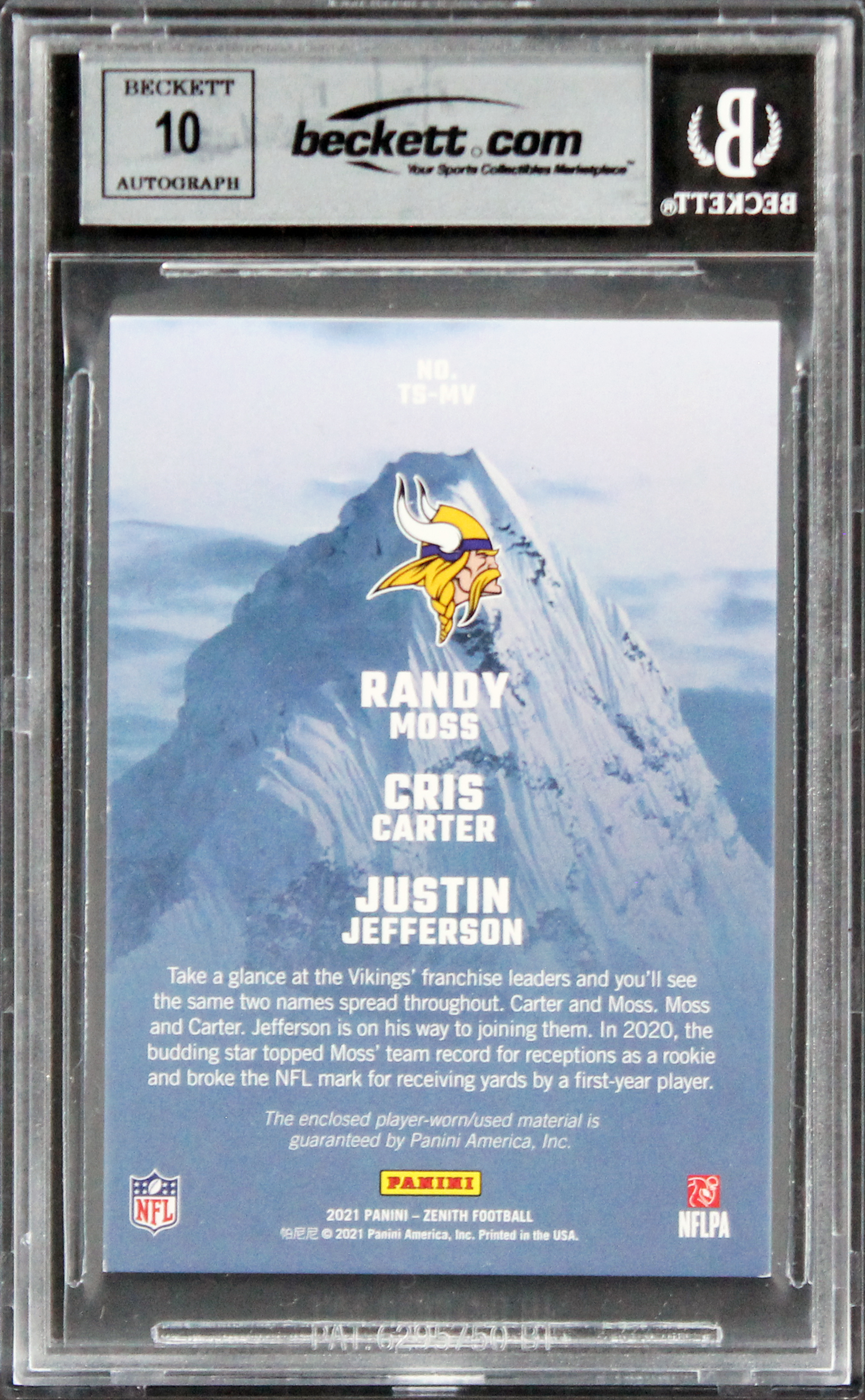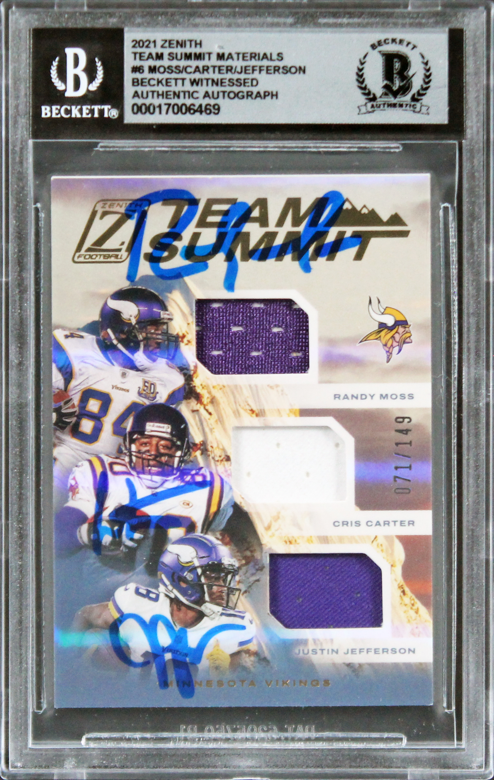 This Autographed Auto Graded Gem Mint 10! 2021 Zenith Team Summit Materials #6 #71/149 Card has been Personally Signed by Randy Moss, Cris Carter & Justin Jefferson of the Minnesota Vikings. This item is 100% Authentic, it comes slabbed and authenticated by Beckett Authentication Services. The authenticity can be verified on Beckett Authentication Services website.