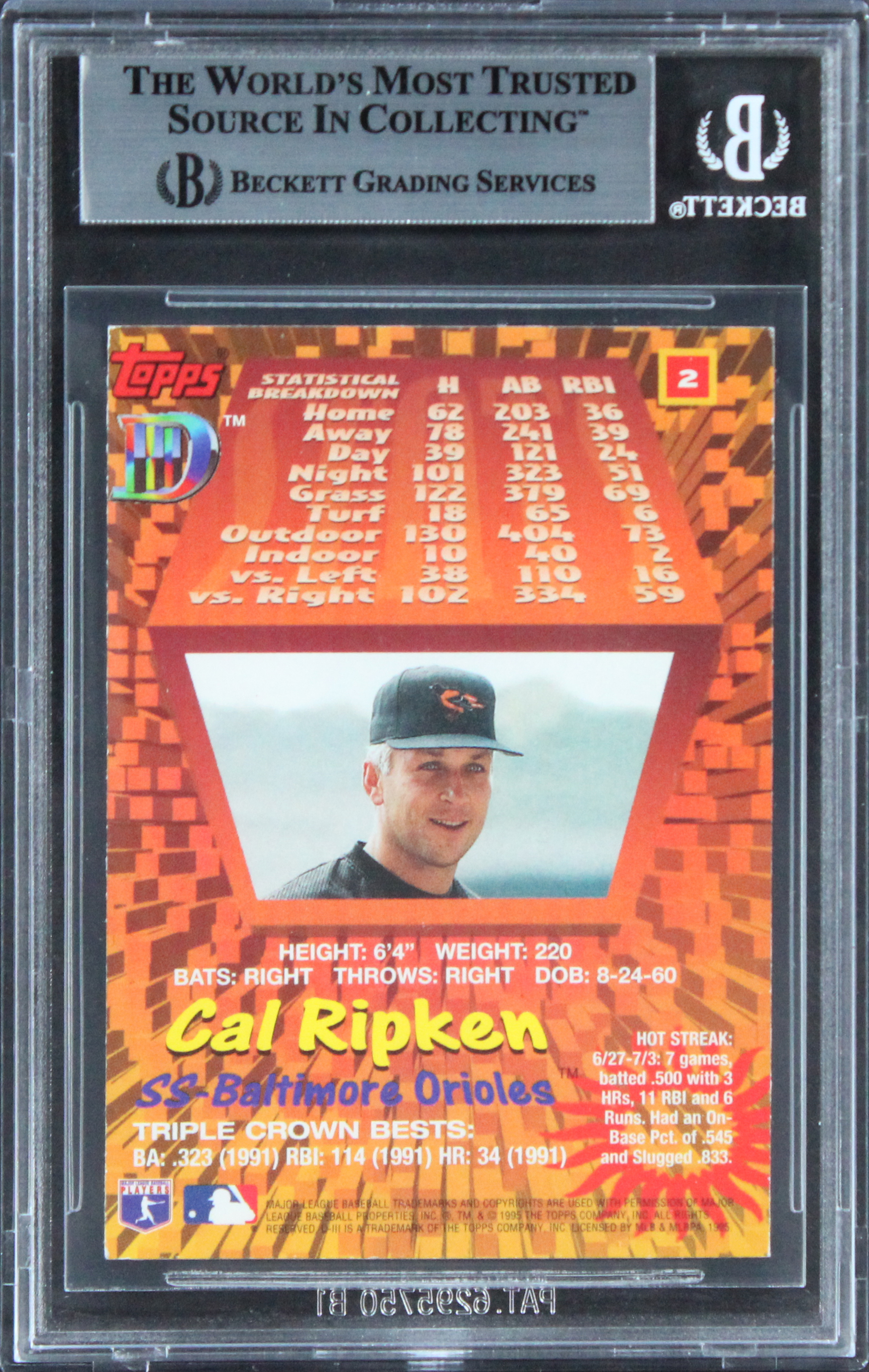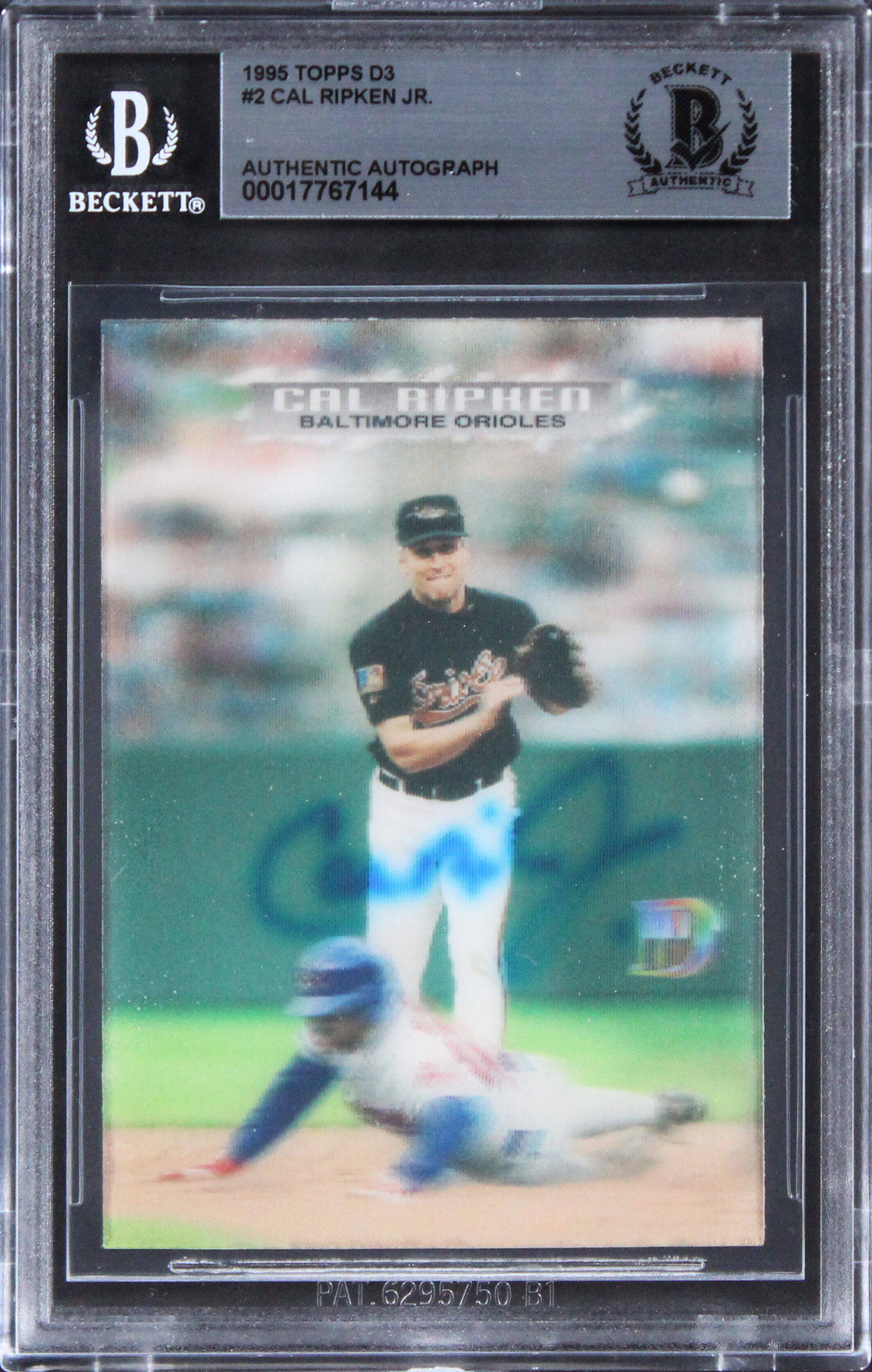 This Autographed 1995 Topps D3 #2 Card has been Personally Signed by Cal Ripken Jr. of the Baltimore Orioles. This item is 100% Authentic, it comes slabbed and authenticated by Beckett Authentication Services. The authenticity can be verified on Beckett Authentication Services website.