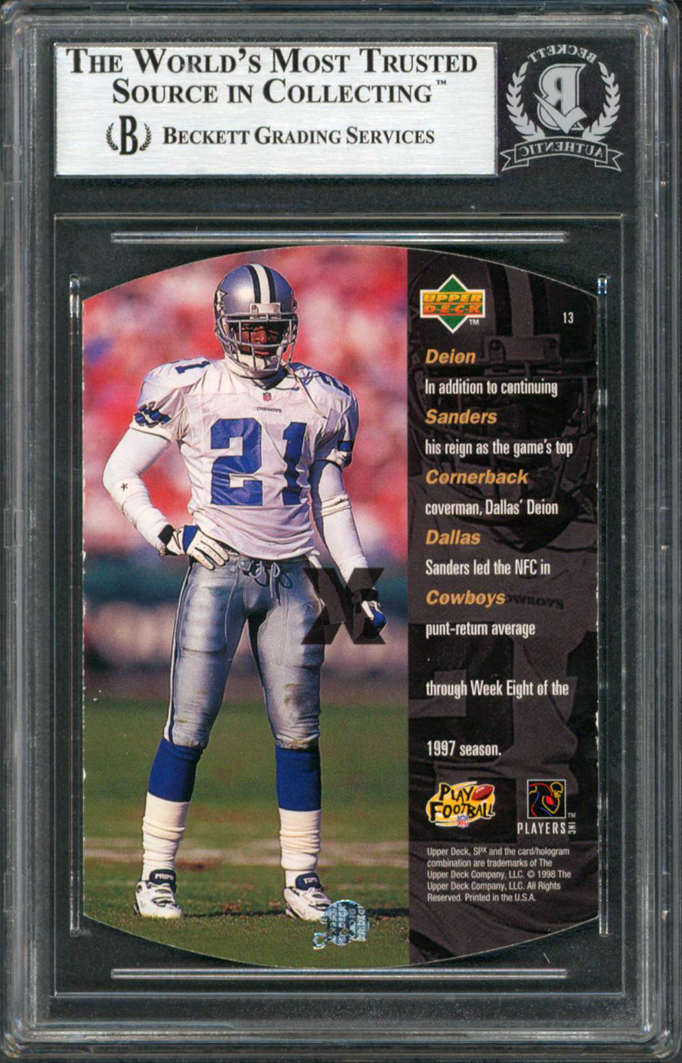 This Autographed 1998 SPX #13 Card has been Personally Signed by Deion Sanders of the Dallas Cowboys. This item is 100% Authentic, it comes slabbed and authenticated by Beckett Authentication Services. The authenticity can be verified on Beckett Authentication Services website.