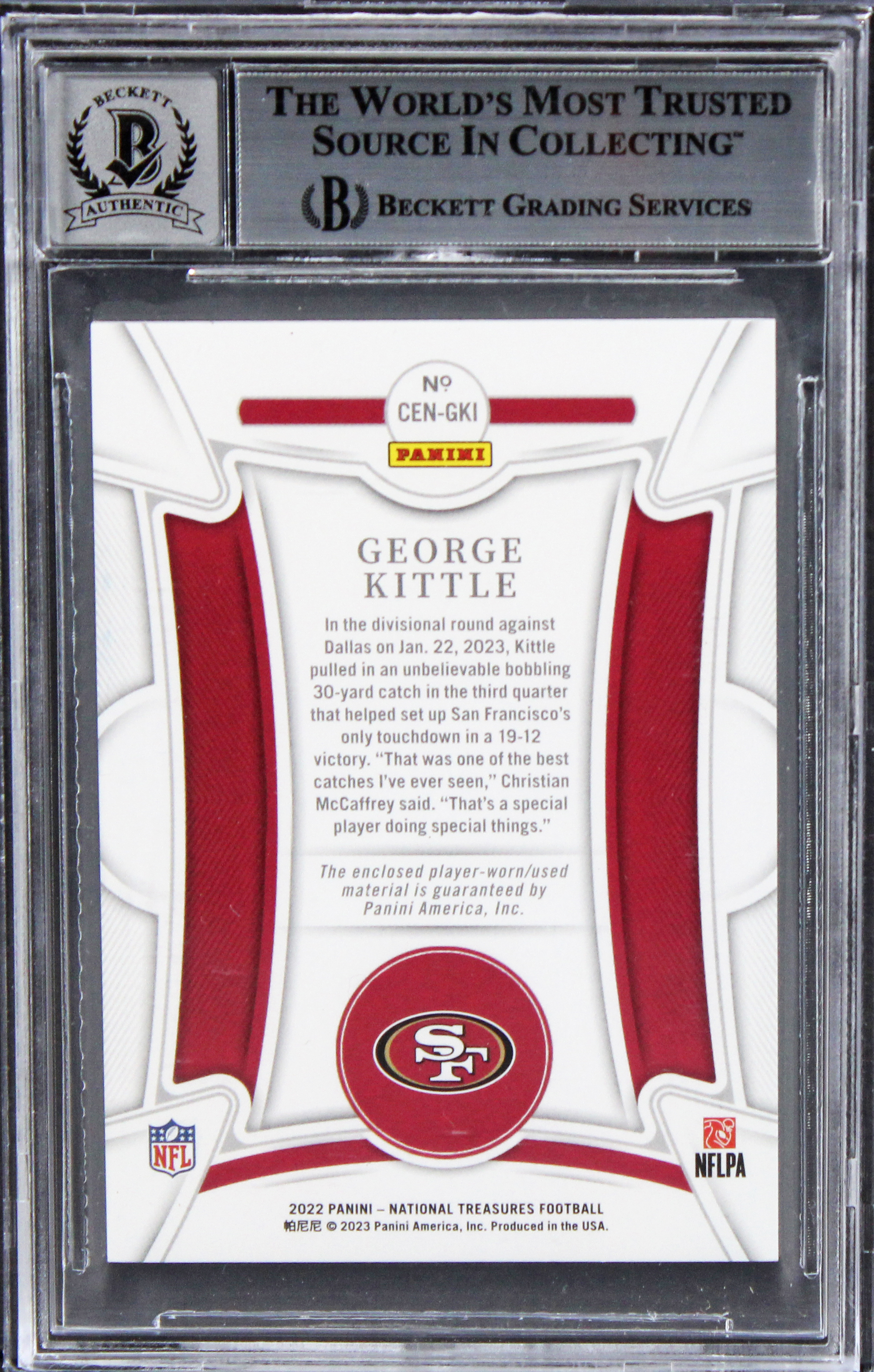 This Autographed Auto Graded Gem Mint 10! 2022 National Treasures Century Materials Gold #27 #31/49 Card has been Personally Signed by George Kittle of the San Francisco 49ers. This item is 100% Authentic, it comes slabbed and authenticated by Beckett Authentication Services. The authenticity can be verified on Beckett Authentication Services website.