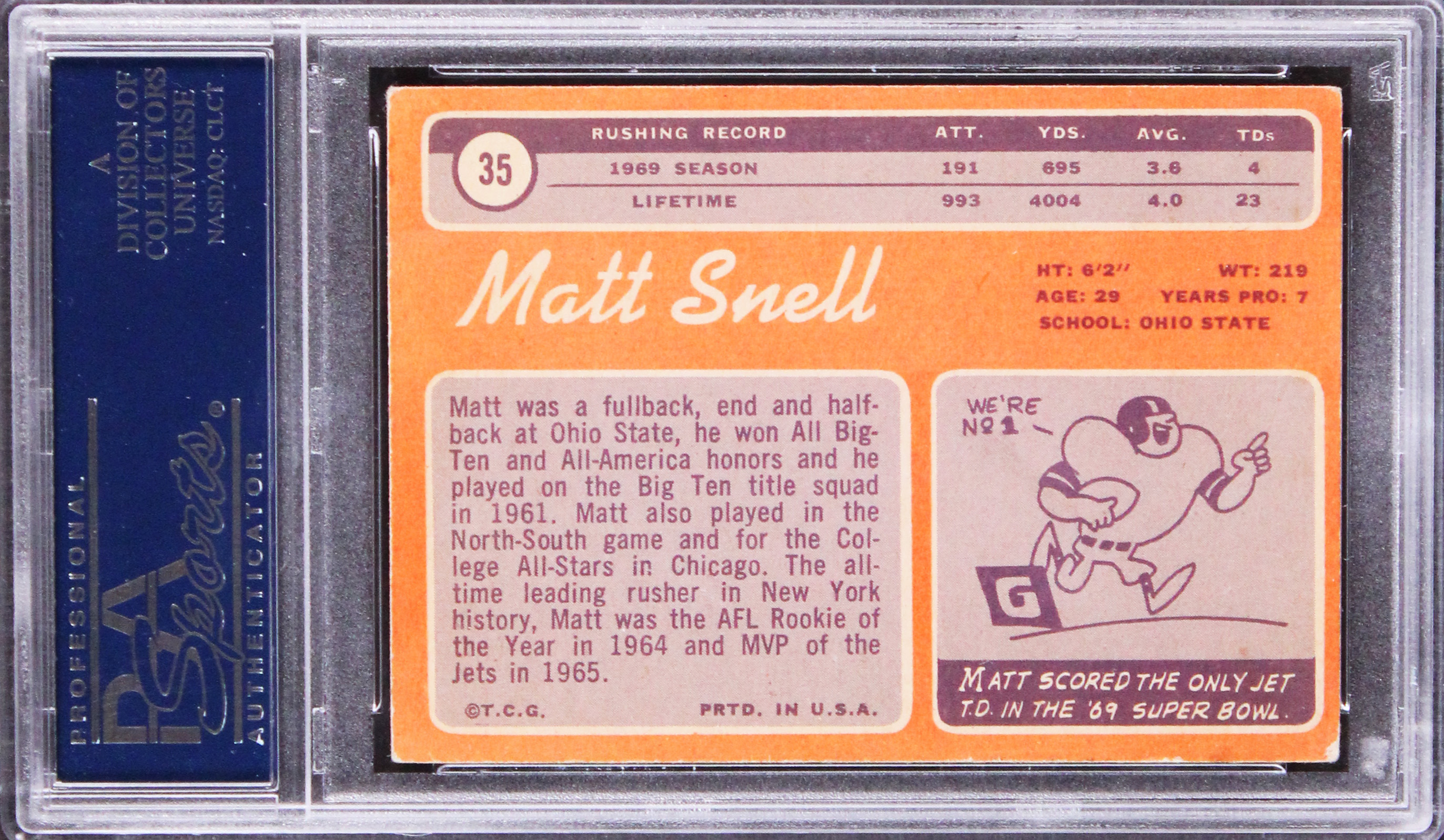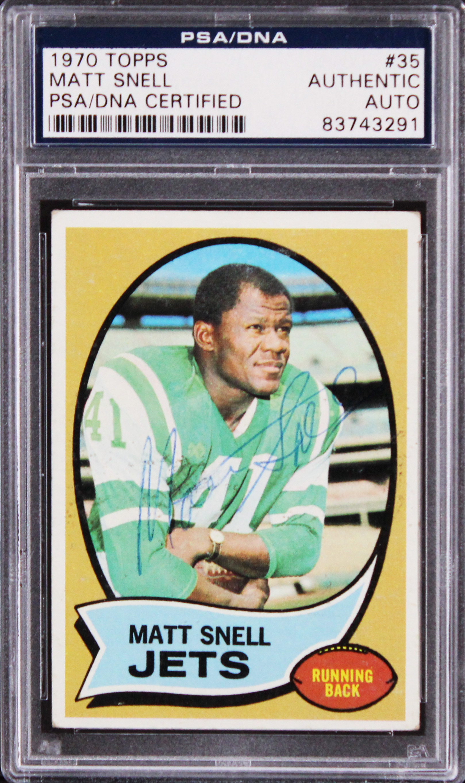 This Autographed 1970 Topps #35 Card has been Personally Signed by Matt Snell of the New York Jets. This item is 100% Authentic, it comes slabbed and authenticated by PSA/DNA. The authenticity can be verified on Professional Sports Authenticator website.