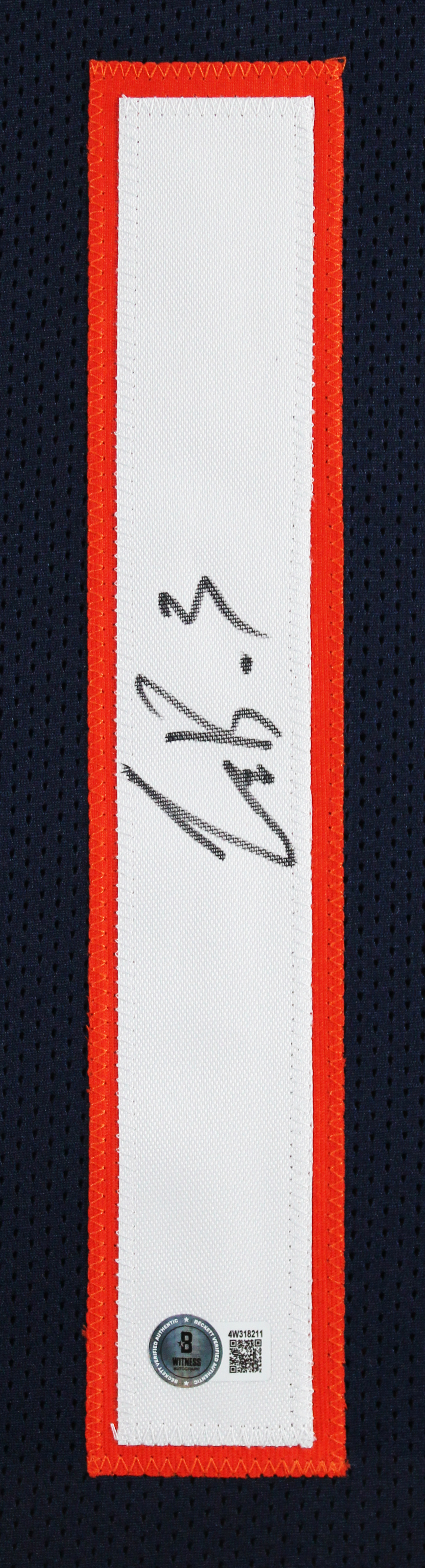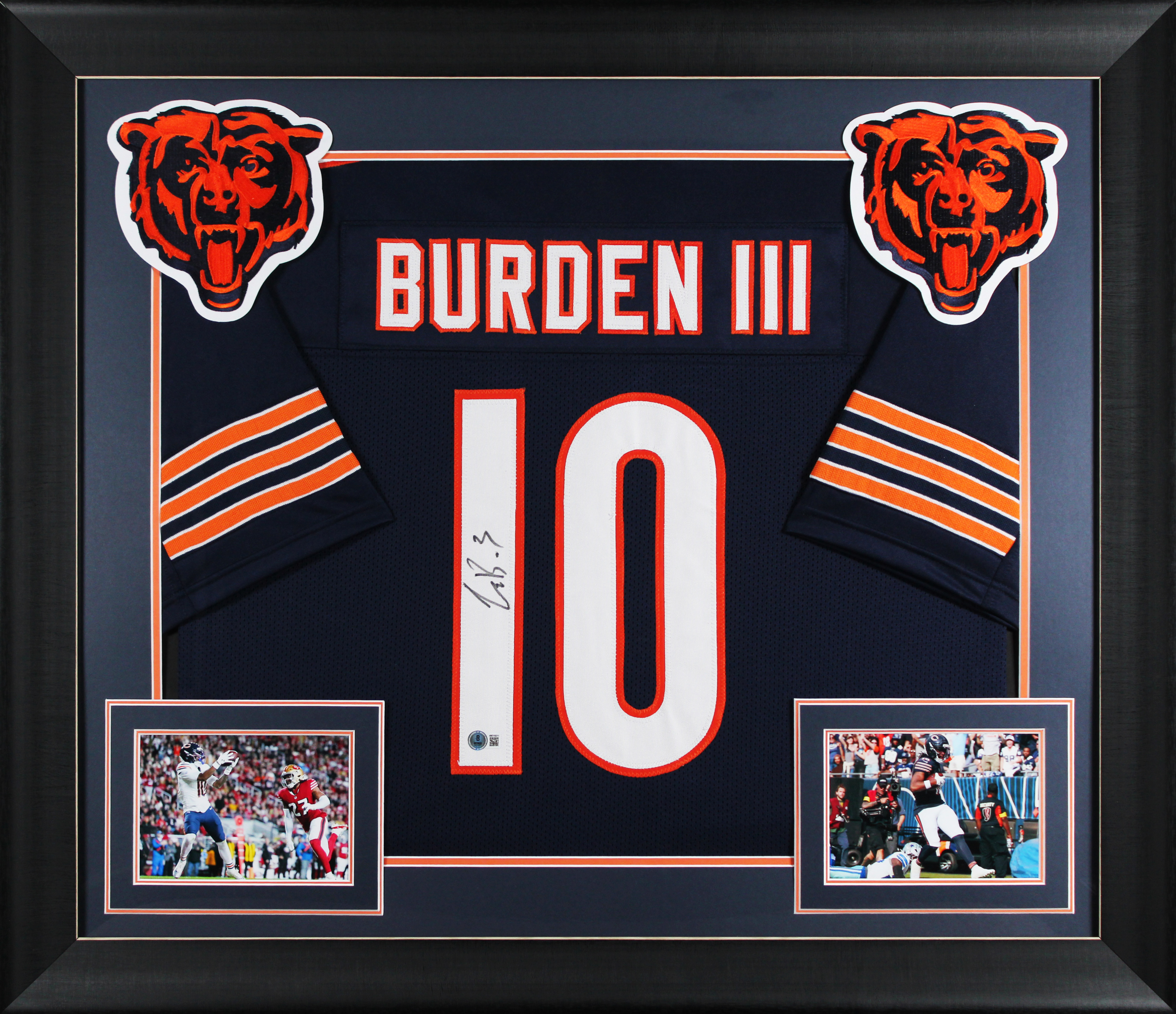 This Autographed Navy Pro Style Framed Jersey has been Personally Signed by Luther Burden III of the Chicago Bears. This item is 100% Authentic to include a hologram by Beckett Authentication Services. This item will come with an affixed Beckett Authentication Services (BAS) authentication sticker, which includes a scannable QR code to verify authenticity. Please note that Beckett no longer provides serial-numbered COA cards, and the attached BAS sticker will serve as the complete authentication for this item. This is a BAS Witnessed Protection Program item which means a Beckett Authentication Service representative was present when this item was being signed. We conducted an autograph signing with Luther Burden III where multiples of the same item were signed. While the photographs are representative of this item, the size, placement and strength of the signature may vary. Each item is hand signed, therefore, each autograph is unique. This item can be verified through BAS Witnessed. This item has been professionally framed to overall dimensions of approximately 32 x 37 inches. This is a X-Large sized, non-branded, custom-stitched Framed Jersey. This jersey will be framed to order, it will take approximately 4-5 business days from purchase date for it to ship.