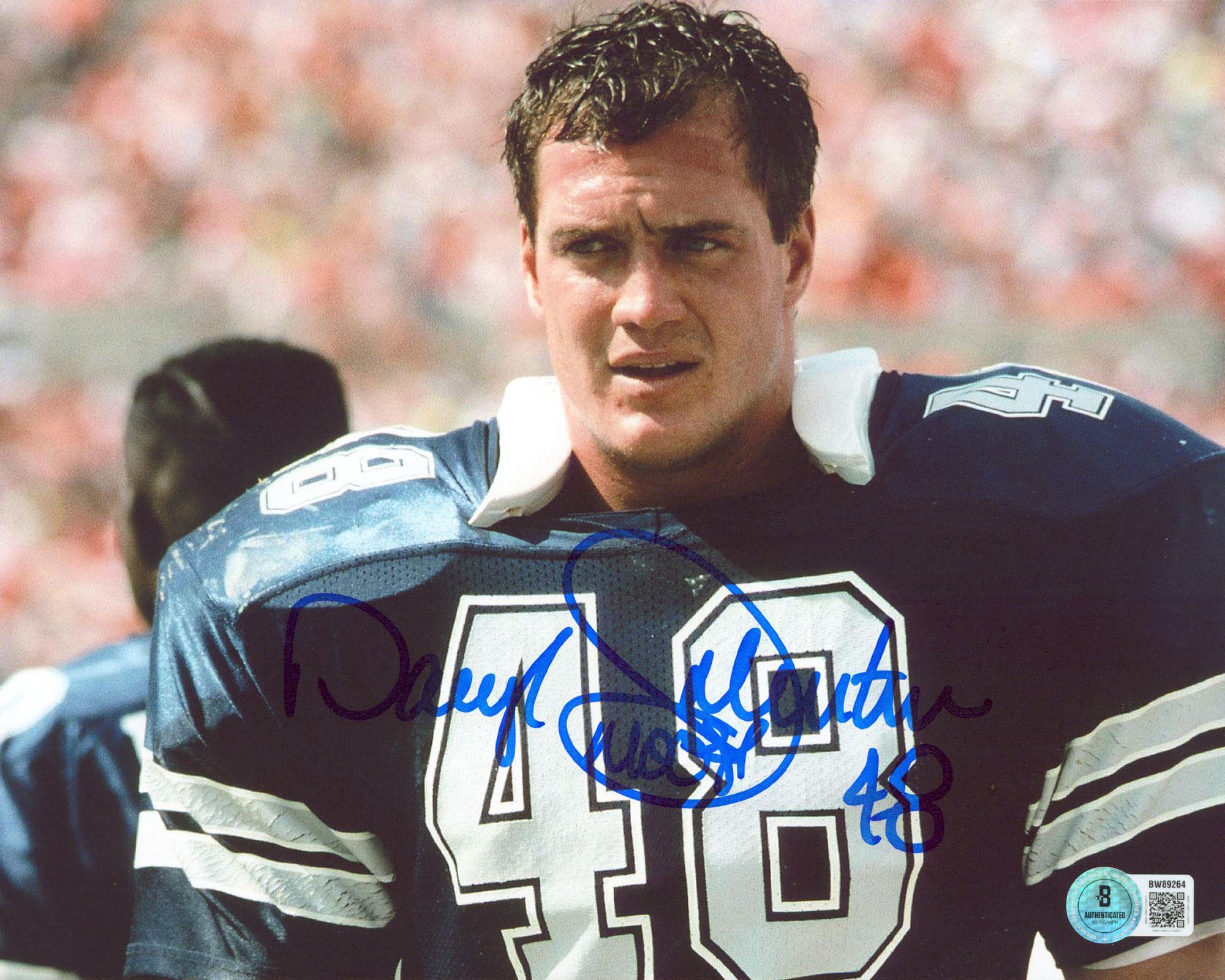 This Autographed Horizontal 8x10 Photo with the inscription of "Moose" has been Personally Signed by Daryl Johnston of the Dallas Cowboys. This item is 100% Authentic to include a hologram by Beckett Authentication Services. This item will come with an affixed Beckett Authentication Services (BAS) authentication sticker, which includes a scannable QR code to verify authenticity. Please note that Beckett no longer provides serial-numbered COA cards, and the attached BAS sticker will serve as the complete authentication for this item. We have multiples of this same item. While the photographs are representative of this item, the size, placement and strength of the signature may vary. Each item is hand signed, therefore, each autograph is unique.