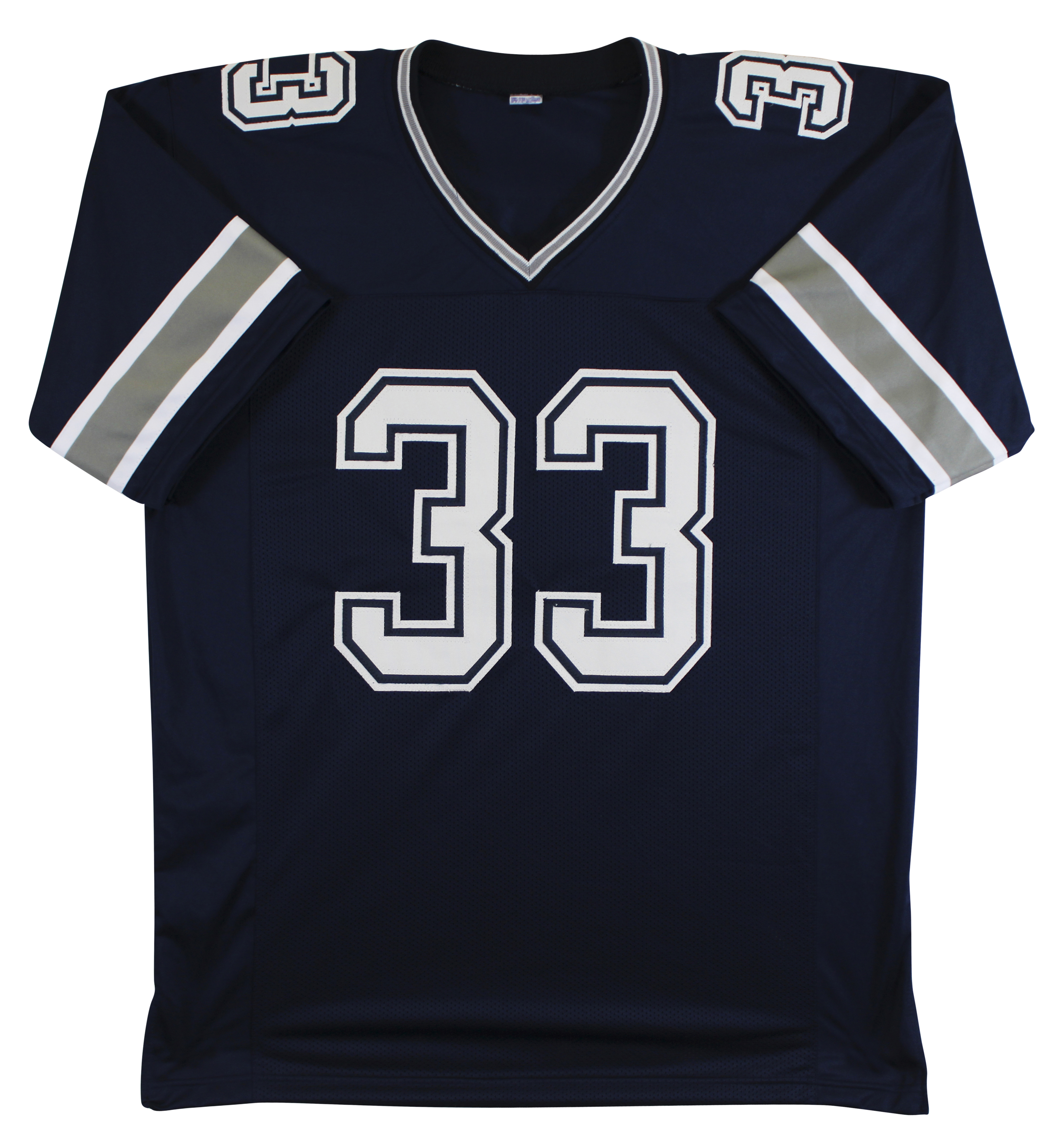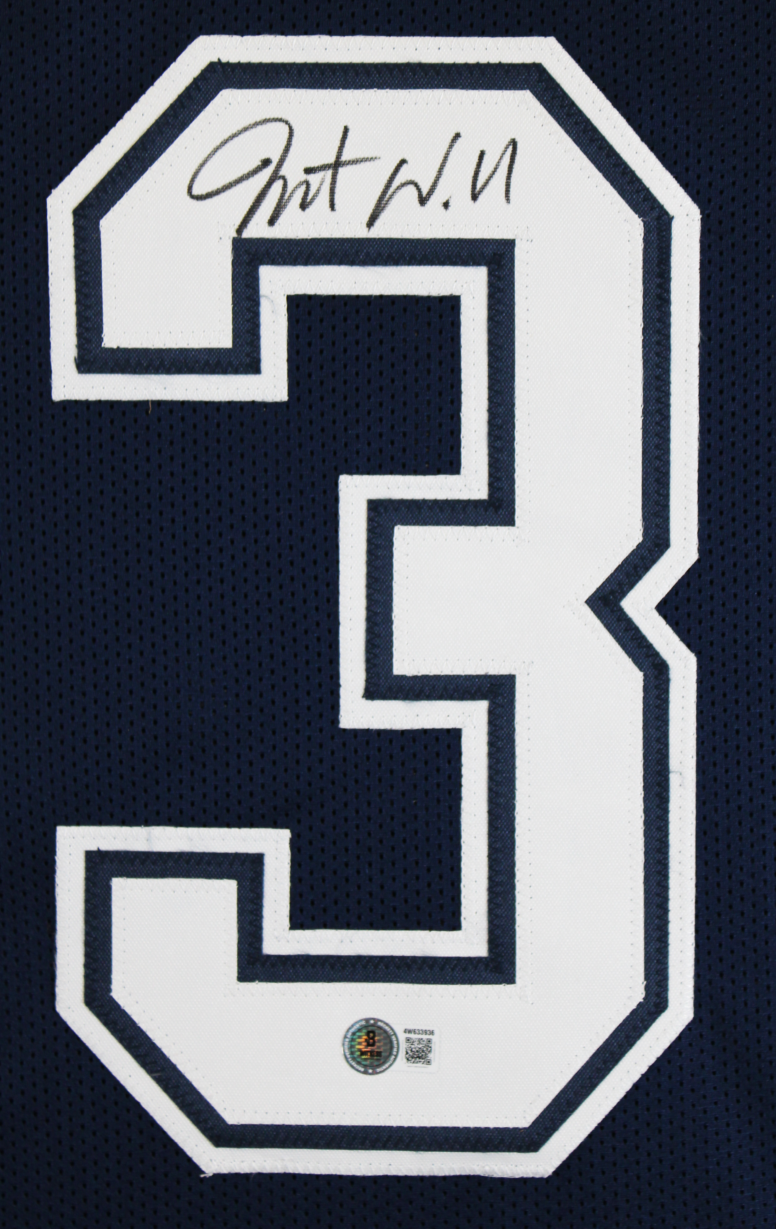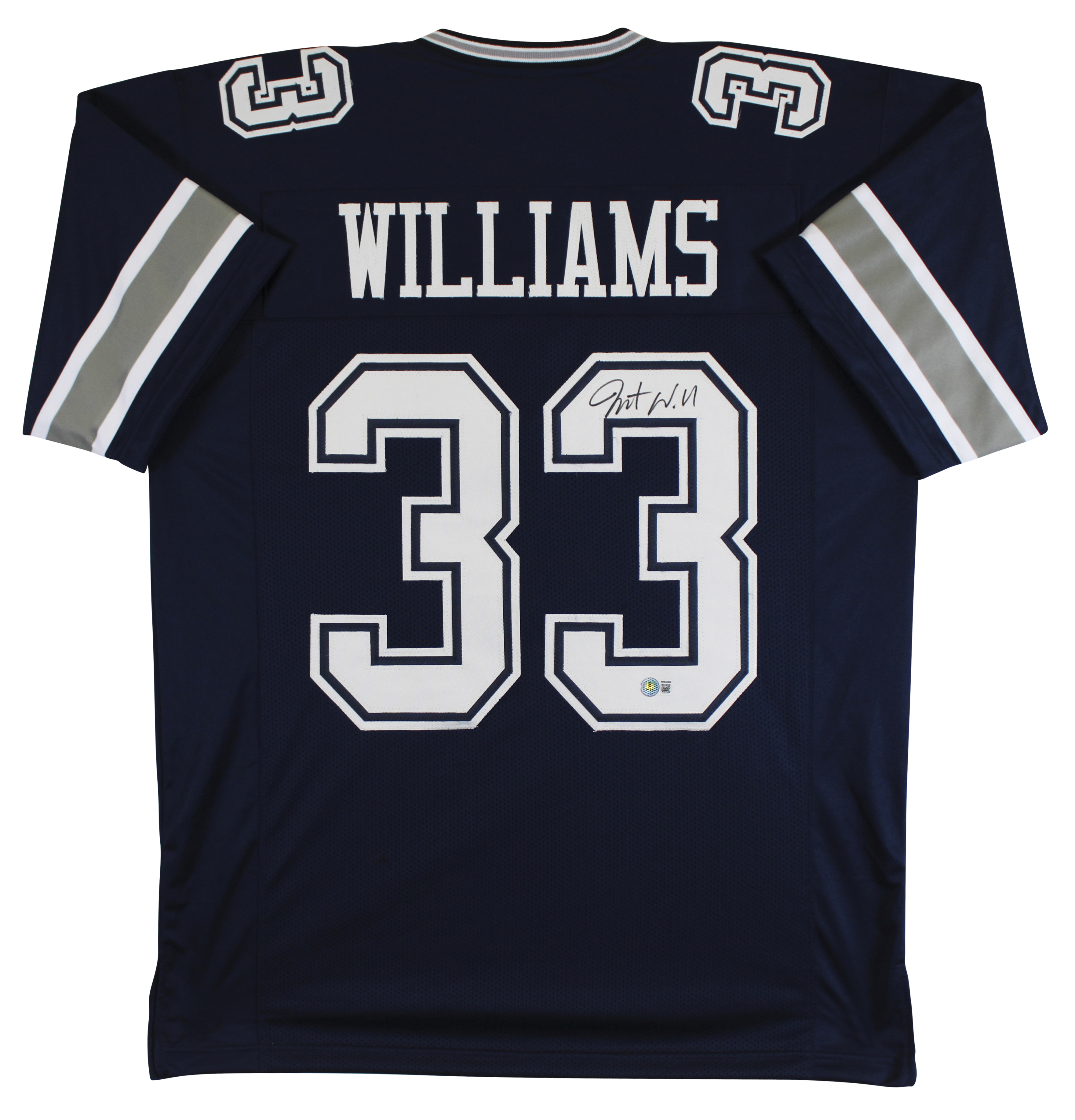 This Autographed Navy Pro Style Jersey has been Personally Signed by Javonte Williams of the Dallas Cowboys. This item is 100% Authentic to include a hologram by Beckett Authentication Services. This item will come with an affixed Beckett Authentication Services (BAS) authentication sticker, which includes a scannable QR code to verify authenticity. Please note that Beckett no longer provides serial-numbered COA cards, and the attached BAS sticker will serve as the complete authentication for this item. This is a BAS Witnessed Protection Program item which means a Beckett Authentication Service representative was present when this item was being signed. We conducted an autograph signing with Javonte Williams where multiples of the same item were signed. While the photographs are representative of this item, the size, placement and strength of the signature may vary. Each item is hand signed, therefore, each autograph is unique. This item can be verified through BAS Witnessed. This is a X-Large sized, non-branded, custom-stitched Jersey.