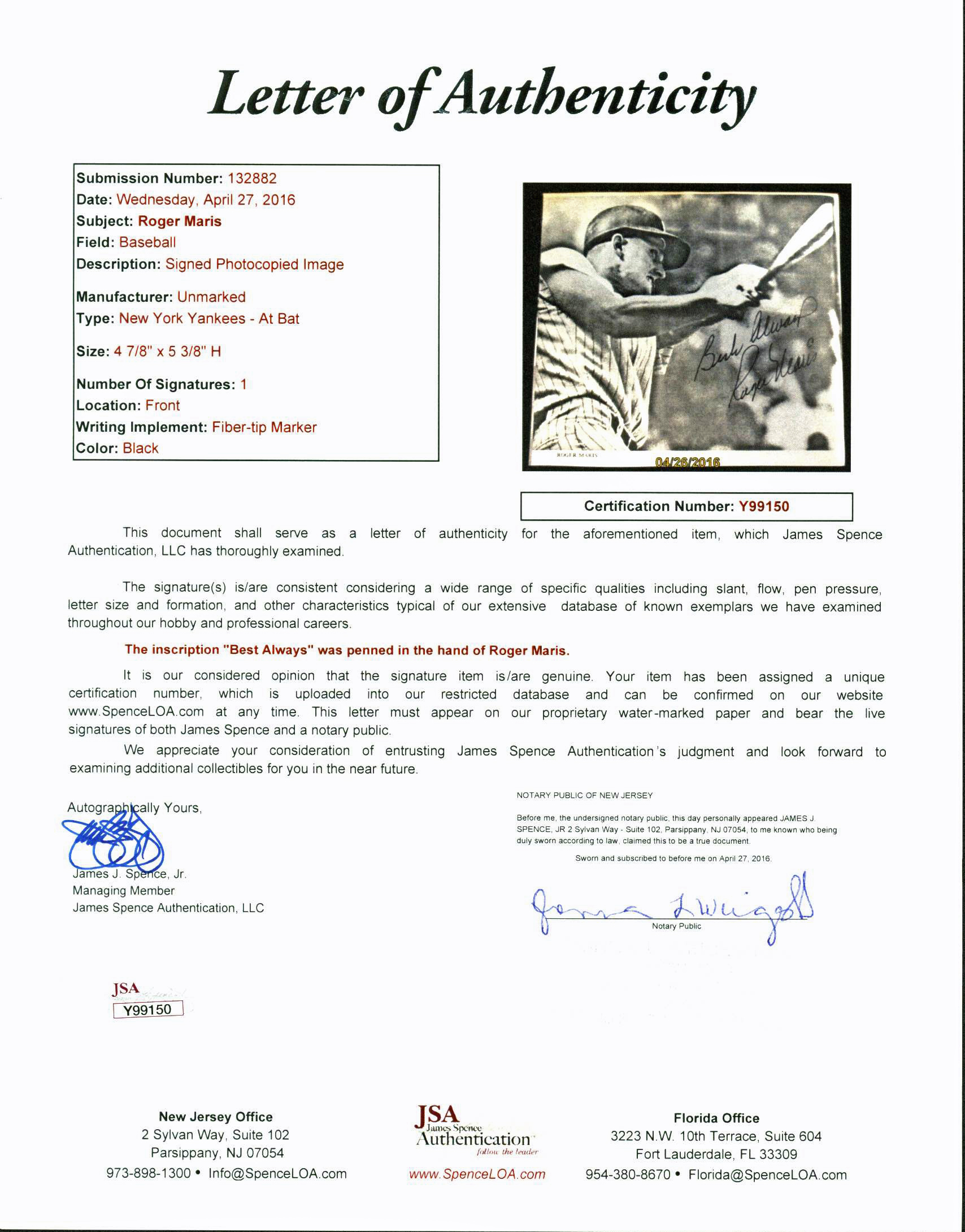 This is a 4.8x5.5 Cut Photo "Best Always" Authentic Signed that has been Personally Signed & Autographed by Roger Maris of the New York Yankees. Maris was known for his killer batting skills, being the first player to break Babe Ruth's single season home run record in 34 years. This photo features Maris doing what he did best - swinging the stick with all his might. It has been signed in black felt tip pen "Best Always, Roger Maris". This item is 100% Authentic to include a Certificate of Authenticity (COA) / hologram by JSA #Y99150.Press Pass Collectibles offers a 100% Lifetime Guarantee on all Autographed & Signed New York Yankees Roger Maris memorabilia.