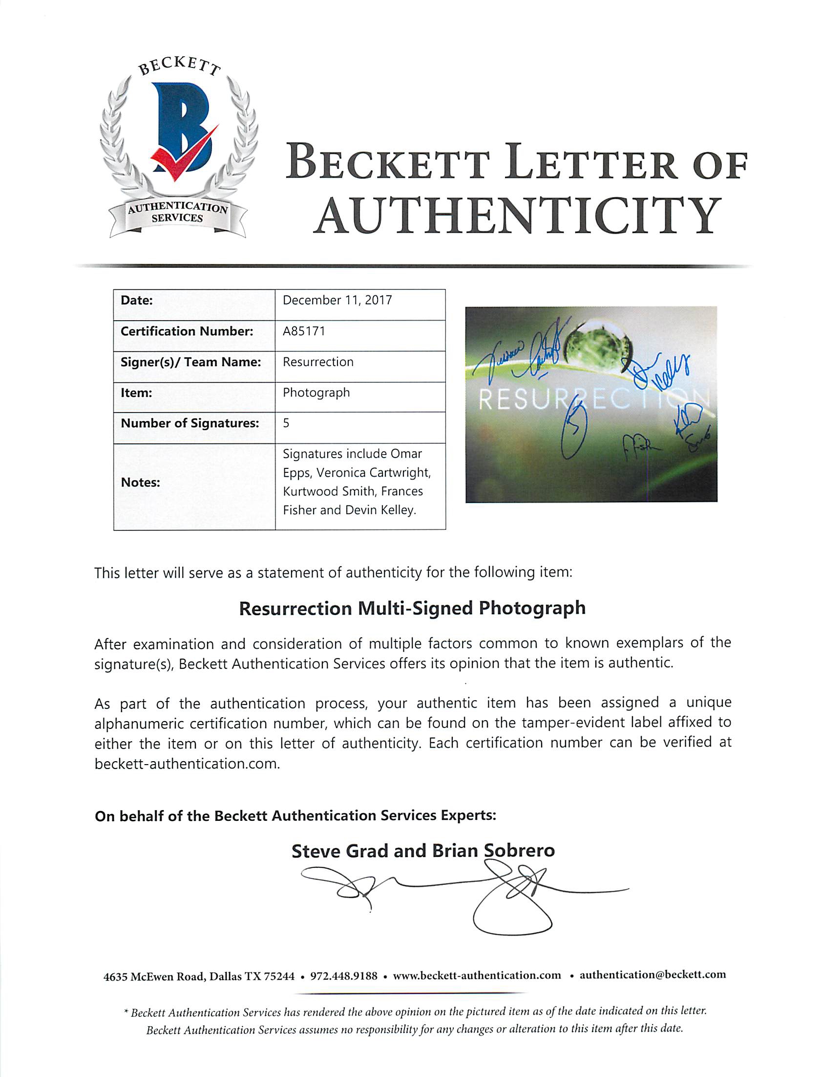 This Autographed 11x14 Photo has been Personally Signed by Omar Epps, Veronica Cartwright, Kurtwood Smith, Frances Fisher & Devin Kelley of Resurrection. This item is 100% Authentic to include a Certificate of Authenticity (COA) / hologram by Beckett Authentication Services.The authenticity can be verified on Beckett Authentication Services website. Press Pass Collectibles only offers Authentic Autographs by Omar Epps, Veronica Cartwright, Kurtwood Smith, Frances Fisher & Devin Kelley through Signings, In-Person Signings or Private Collections to include a 100% money back Lifetime Authenticity Guarantee.