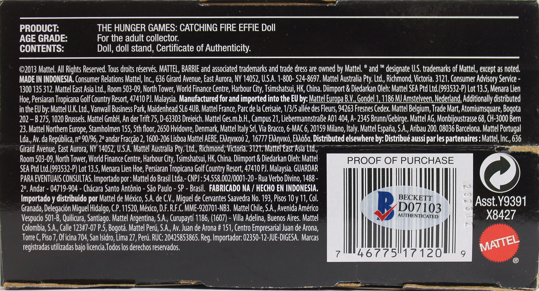 This Autographed The Hunger Games: Catching Fire Effie Black Label Barbie Collector Doll has been Personally Signed by Elizabeth Banks of The Hunger Games Catching Fire. This item is 100% Authentic to include a Certificate of Authenticity (COA) / hologram by Beckett Authentication Services.The authenticity can be verified on Beckett Authentication Services website. Press Pass Collectibles only offers Authentic Autographs by Elizabeth Banks through Signings, In-Person Signings or Private Collections to include a 100% money back Lifetime Authenticity Guarantee.
