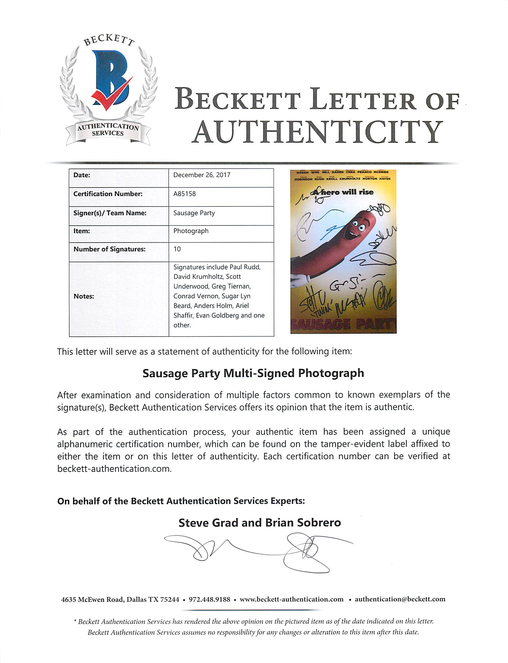 This Autographed 12x18 Photo has been Personally Signed by Paul Rudd, David Krumholtz, Scott Underwood, Greg Tiernan, Conrad Vernon, Sugar Lyn Beard, Anders Holm, Ariel Shaffir, Evan Goldberg and one other of Sausage Party. This item is 100% Authentic to include a Certificate of Authenticity (COA) / hologram by Beckett Authentication Services.The authenticity can be verified on Beckett Authentication Services website. Press Pass Collectibles only offers Authentic Autographs by Paul Rudd, David Krumholtz, Scott Underwood, Greg Tiernan, Conrad Vernon, Sugar Lyn Beard, Anders Holm, Ariel Shaffir, Evan Goldberg and one other through Signings, In-Person Signings or Private Collections to include a 100% money back Lifetime Authenticity Guarantee.