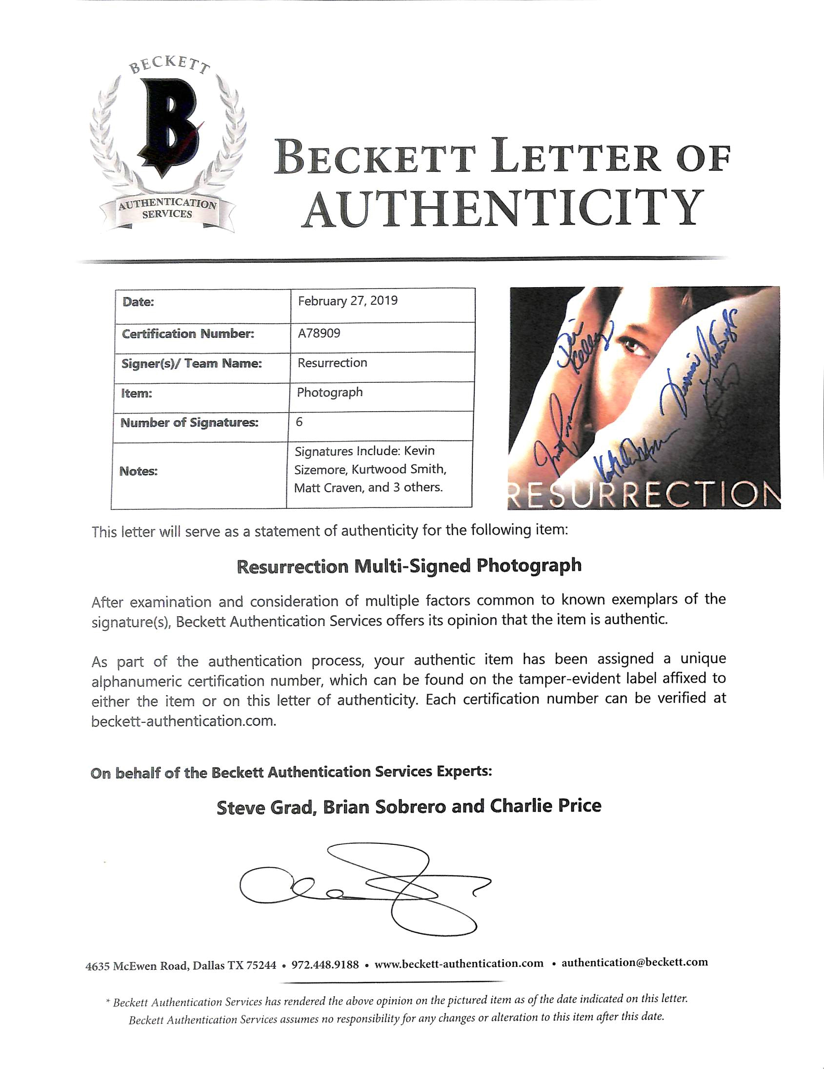 This Autographed 11x14 Photo has been Personally Signed by Kurtwood Smith, Devin Kelley, Matt Craven, Veronica Cartwright, Kevin Sizemore & Kathleen Munroe of Resurrection. Photo DOES NOT come with the PSA Cert Card and is only the PSA Hologram. This item is 100% Authentic to include a Certificate of Authenticity (COA) / hologram by Beckett Authentication Services.The authenticity can be verified on Beckett Authentication Services website. Press Pass Collectibles only offers Authentic Autographs by Kurtwood Smith, Devin Kelley, Matt Craven, Veronica Cartwright, Kevin Sizemore & Kathleen Munroe through Signings, In-Person Signings or Private Collections to include a 100% money back Lifetime Authenticity Guarantee.