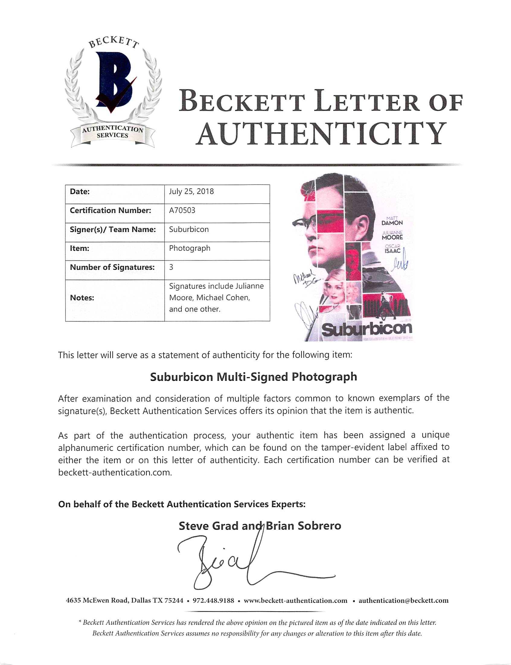 This Autographed 11x17 Photo has been Personally Signed by julianne Moore, Michael Cohen +1 of Suburbicon. This item is 100% Authentic to include a Certificate of Authenticity (COA) / hologram by Beckett Authentication Services.The authenticity can be verified on Beckett Authentication Services website. Please refer to photos prior to purchase. Press Pass Collectibles only offers Authentic Autographs by julianne Moore, Michael Cohen +1 through Signings, In-Person Signings or Private Collections to include a 100% money back Lifetime Authenticity Guarantee.