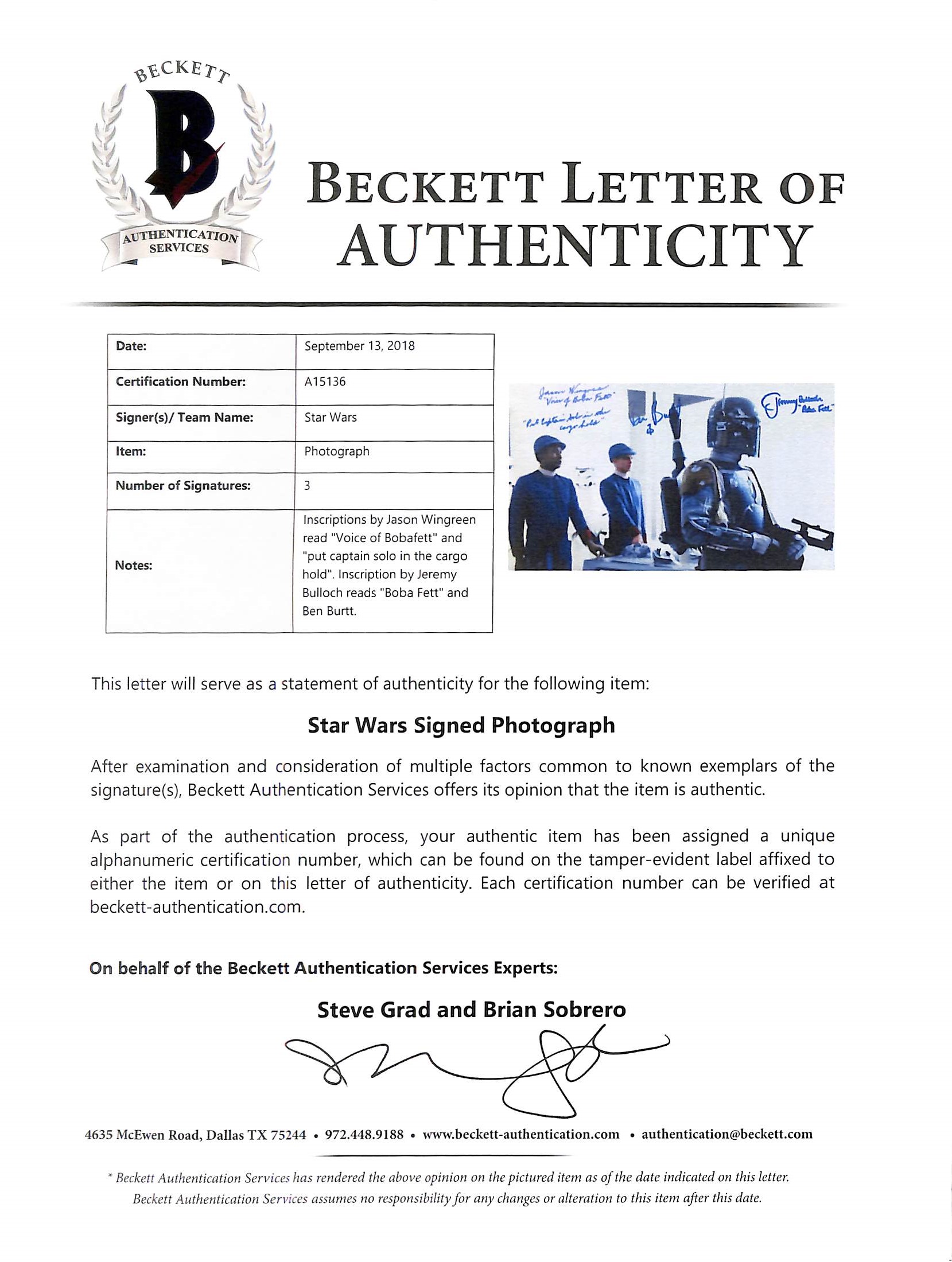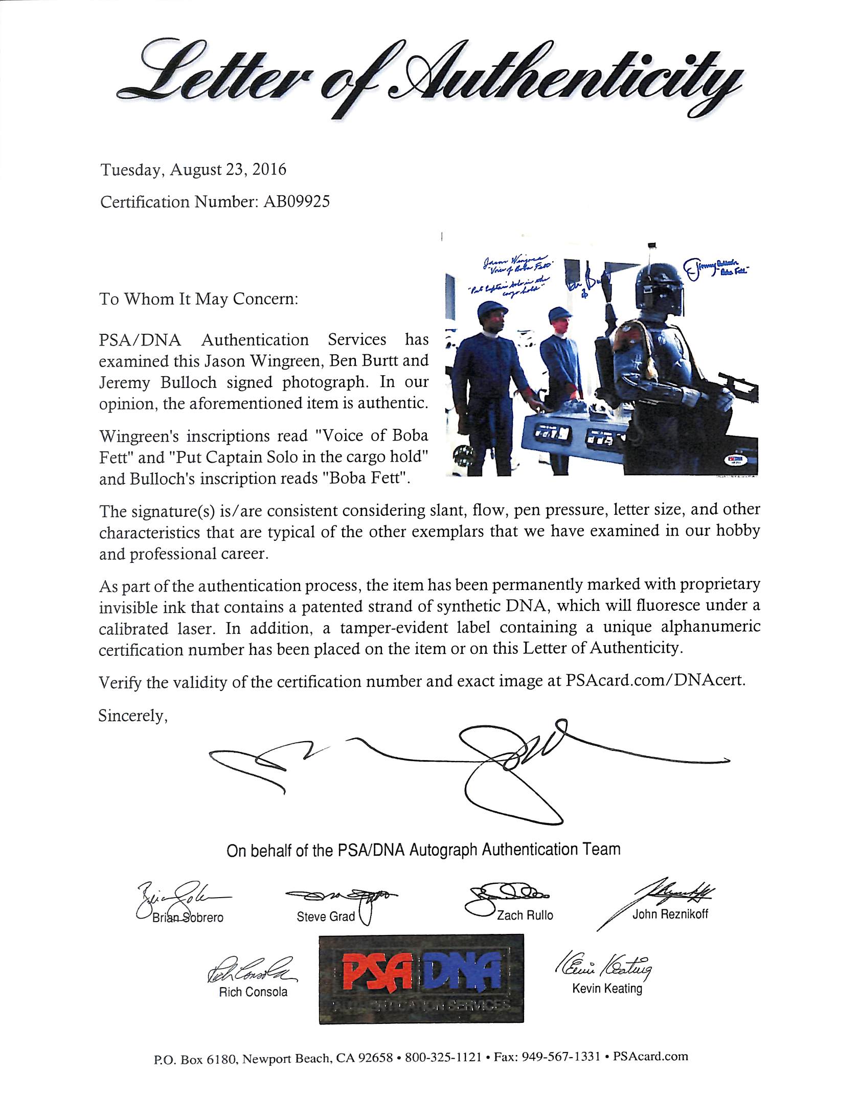 This Autographed 11x14 Photo with the inscription of "Voice Of Boba Fett, Put Captain Solo In The Cargo Hold & Boba Fett" has been Personally Signed by Jason Wingreen, Jeremy Bullock & Ben Burtt of Star Wars The Empire Strikes Back. There is a small 'dimple' located near the middle top edge of the photo. This item is 100% Authentic to include a Certificate of Authenticity (COA) / hologram by Beckett Authentication Services. The authenticity can be verified on Beckett Authentication Services website. Press Pass Collectibles only offers Authentic Autographs by Jason Wingreen, Jeremy Bullock & Ben Burtt through Signings, In-Person Signings or Private Collections to include a 100% money back Lifetime Authenticity Guarantee.