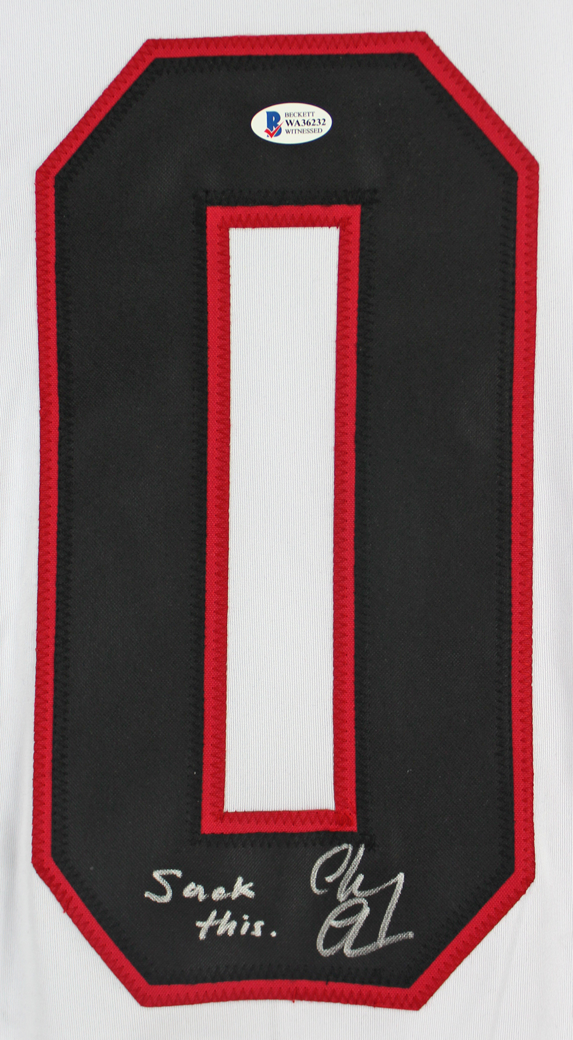 This Autographed Santa Clark Jersey with the inscription of "Suck This" has been Personally Signed by Chevy Chase of National Lampoon's Christmas Vacation. This item is 100% Authentic to include a Certificate of Authenticity (COA) / hologram by Beckett Authentication Services. This is a BAS Witnessed Protection Program item which means a Beckett Authentication Service representative was present when this item was being signed. The authenticity can be verified on Beckett Authentication Services website. This is a X-Large sized, non-branded, custom-stitched Jersey.