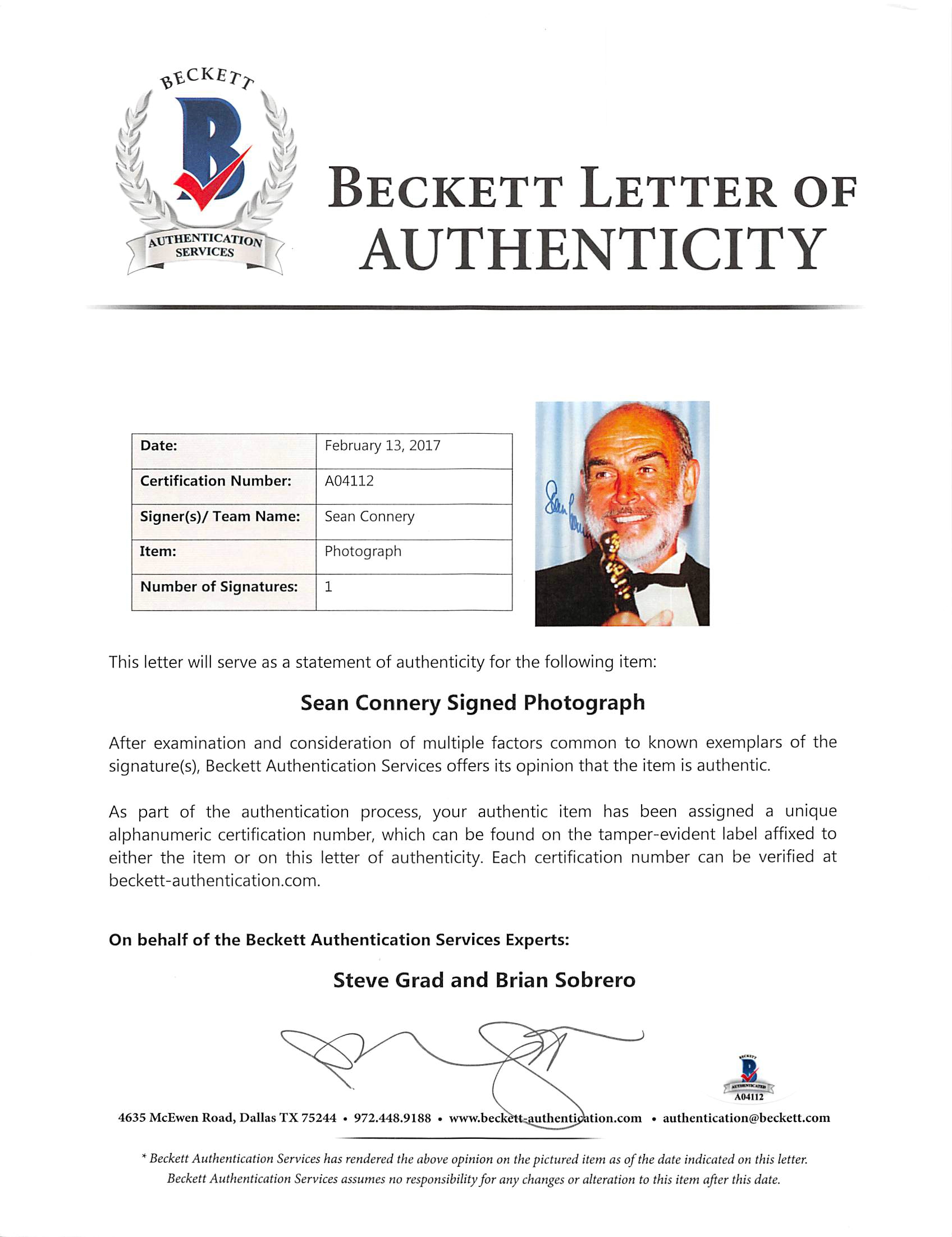 This Autographed 8x10 Photo has been Personally Signed by Sean Connery of The Untouchables. This item is 100% Authentic to include a Certificate of Authenticity (COA) / hologram by Beckett Authentication Services. The authenticity can be verified on Beckett Authentication Services website.