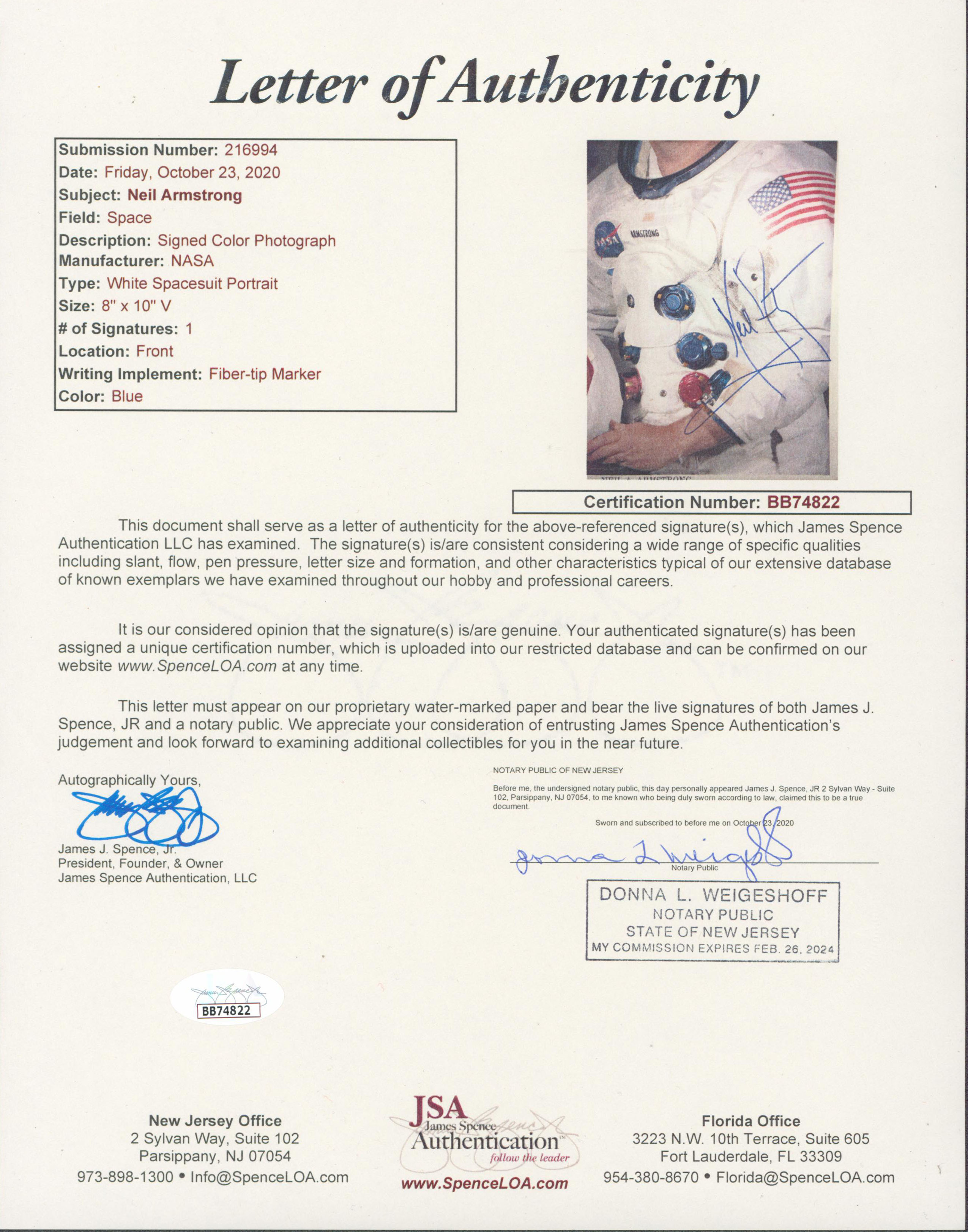 This Autographed 8x10 Photo has been Personally Signed by Neil Armstrong of Apollo 11. This item is 100% Authentic to include a Certificate of Authenticity (COA) / hologram by JSA. The authenticity can be verified on JSA website.