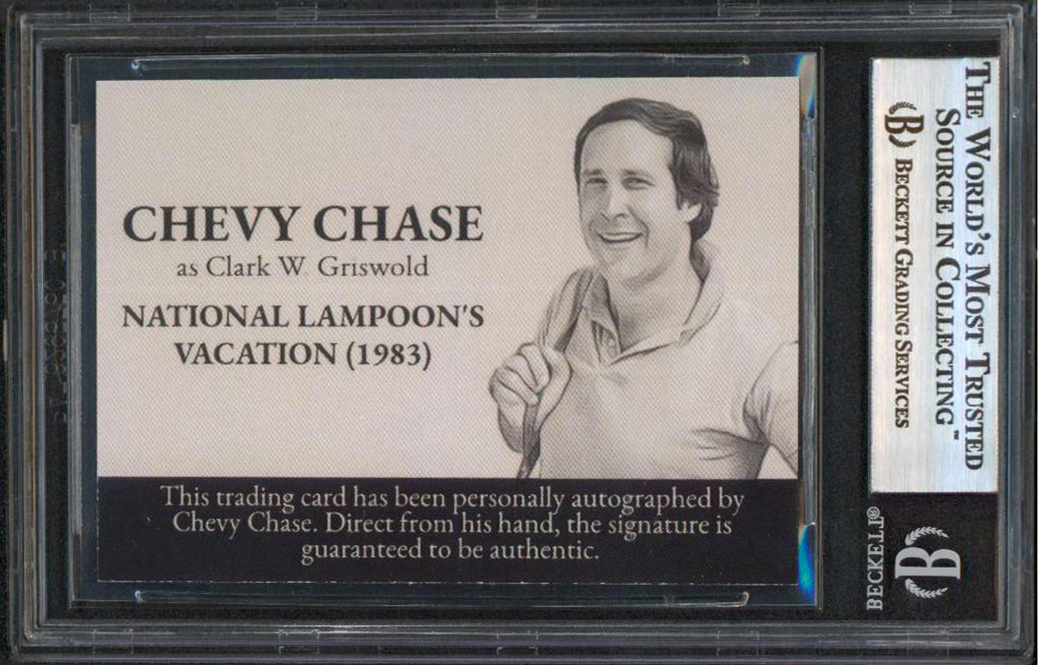 This Autographed Card has been Personally Signed by Chevy Chase of National Lampoon's Vacation. This item is 100% Authentic, it comes slabbed and authenticated by Beckett Authentication Services. This is a stock item. We conducted an autograph signing with Chevy Chase and we have several of these available. The one you will receive will be of equal quality to the one pictured. This item can be verified through