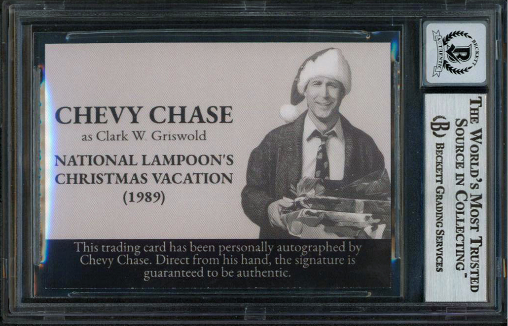 This Autographed Auto Graded Gem Mint 10! Card has been Personally Signed by Chevy Chase of National Lampoon's Christmas Vacation. This item is 100% Authentic, it comes slabbed and authenticated by Beckett Authentication Services. This is a stock item. We conducted an autograph signing with Chevy Chase and we have several of these available. The one you will receive will be of equal quality to the one pictured. This item can be verified through