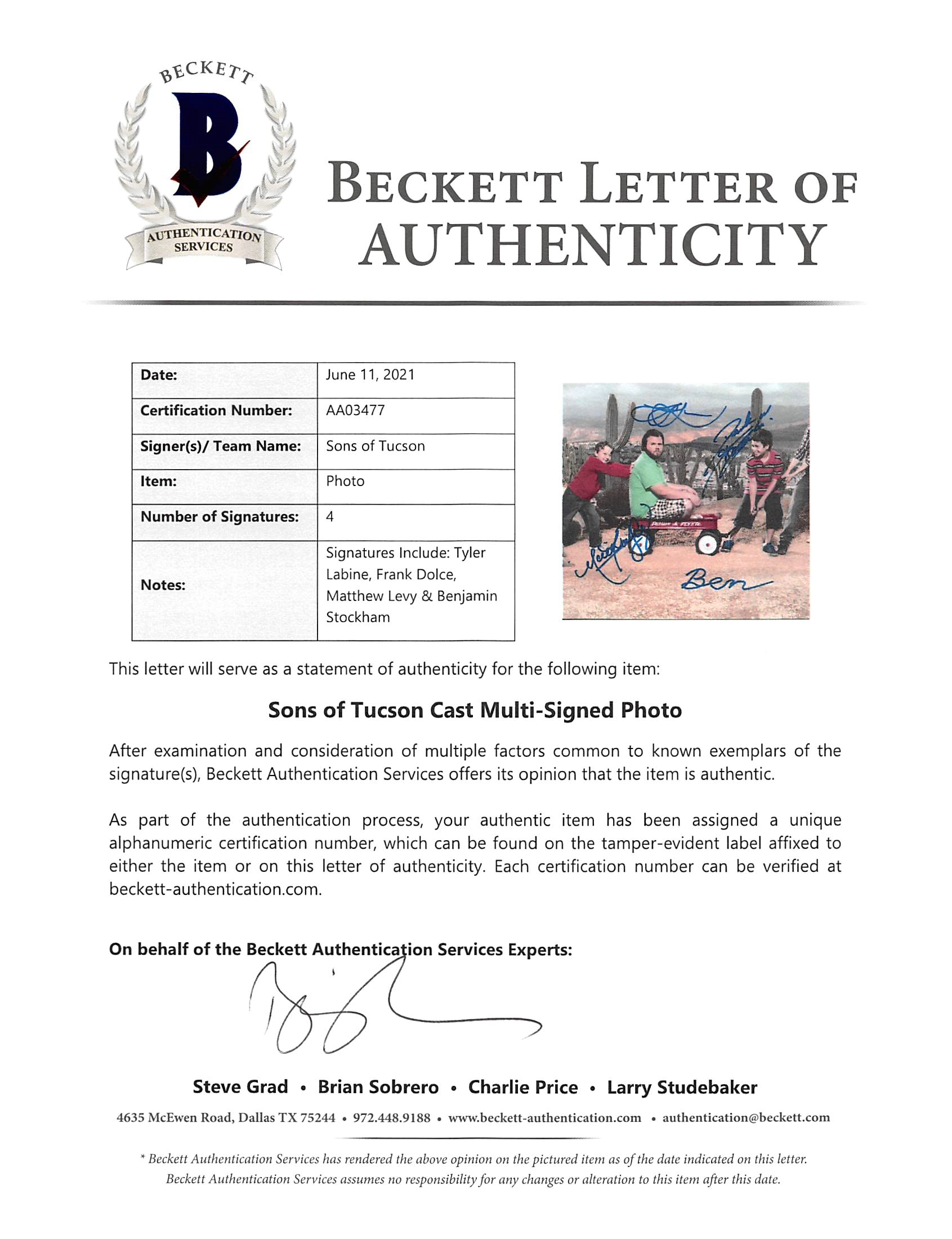 This Autographed 10x15 Photo has been Personally Signed by Tyler Labine, Frank Dolce, Matthew Levy & Benjamin Stockham of Sons Of Tucson. This item is 100% Authentic to include a Certificate of Authenticity (COA) / hologram by Beckett Authentication Services. The authenticity can be verified on Beckett Authentication Services website.