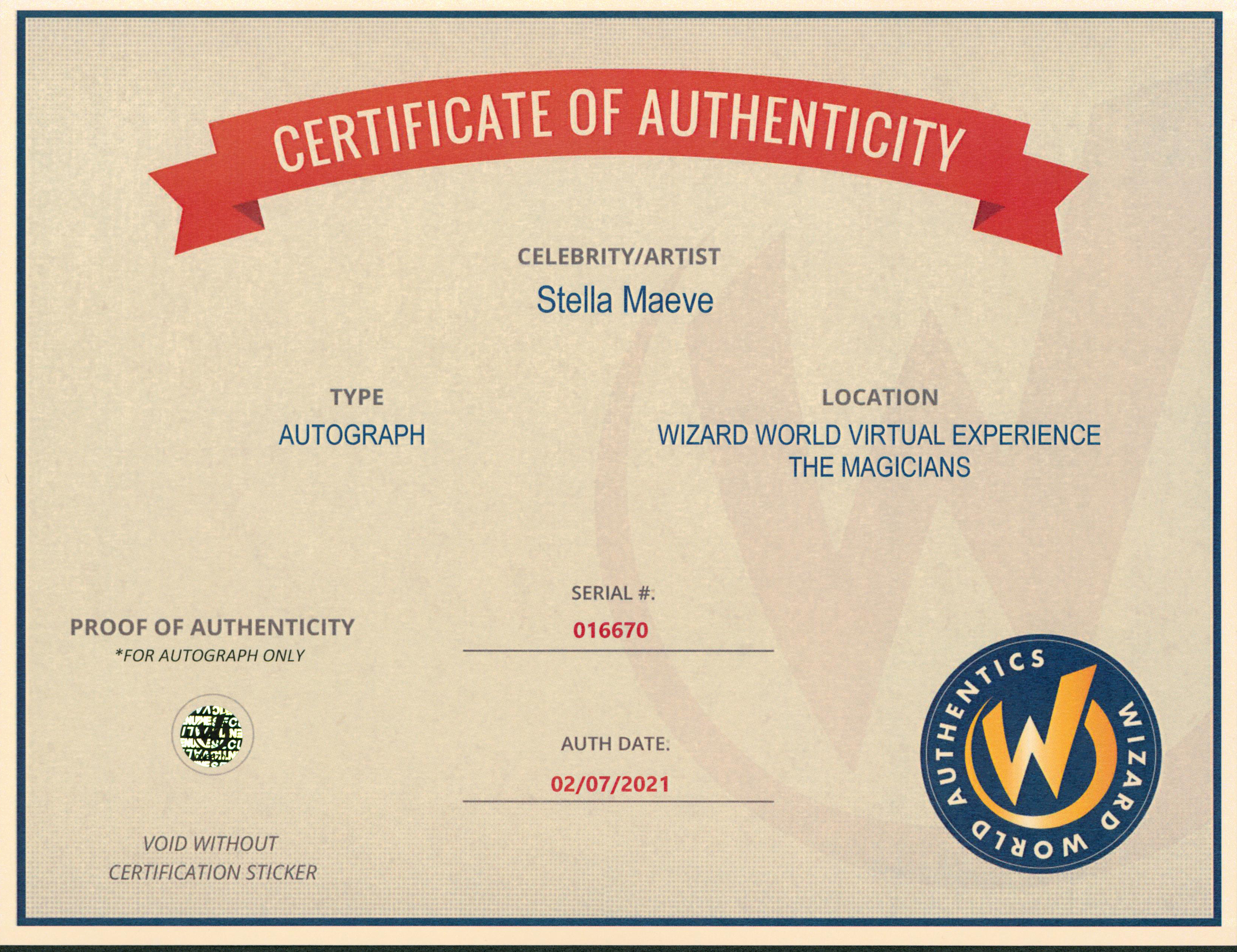 This Autographed 8x10 Photo has been Personally Signed by Stella Maeve of The Magicians. This item is 100% Authentic to include a Certificate of Authenticity (COA) / hologram by Wizard World Authentics. A Wizard World Authentics representative was present when this item was being signed, the date of the signing is notated on the COA. We have multiples of this same item. While the photographs are representative of this item, the size, placement and strength of the signature may vary. Each item is hand signed, therefore, each autograph is unique.