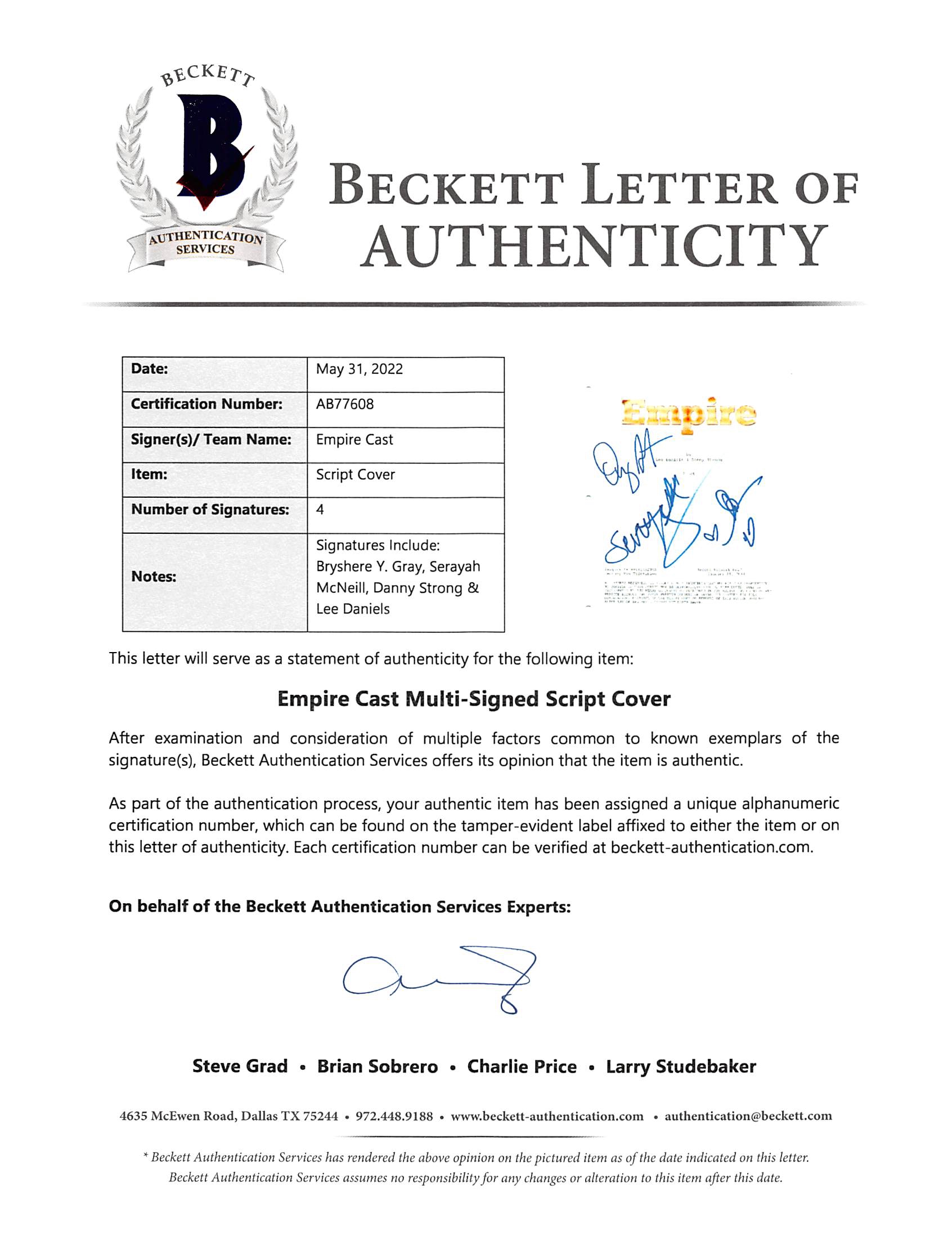 This Autographed Empire 8.5x11 Script Cover has been Personally Signed by Bryshere Y. Gray, Serayah McNeill, Danny Strong & Lee Daniels of Empire. This item is 100% Authentic to include a Certificate of Authenticity (COA) / hologram by Beckett Authentication Services. The authenticity can be verified on Beckett Authentication Services website.