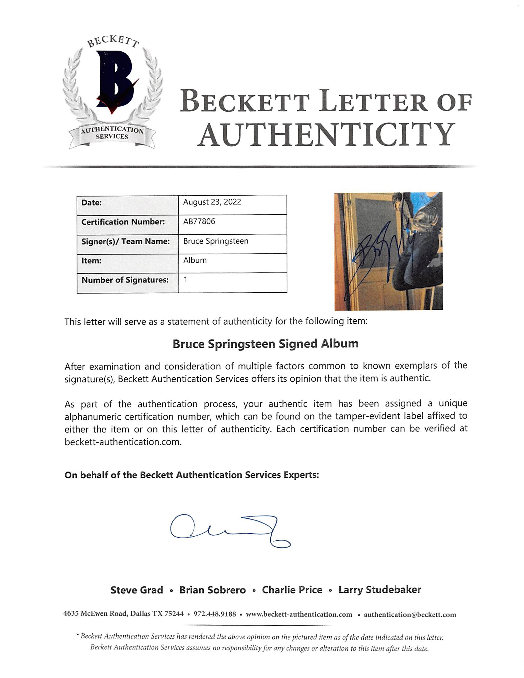 This Autographed Dancing In The Dark Album Cover (without vinyl) has been Personally Signed by Bruce Springsteen. This item is 100% Authentic to include a Certificate of Authenticity (COA) / hologram by Beckett Authentication Services. The authenticity can be verified on Beckett Authentication Services website.