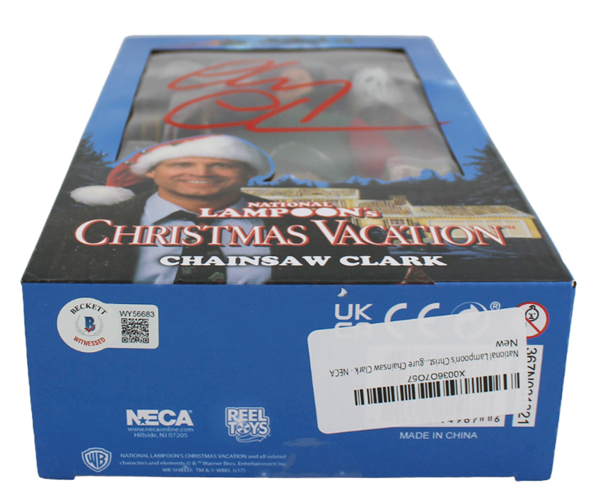 This Autographed NECA Chainsaw Clark Figure w/ Red Signature has been Personally Signed by Chevy Chase of National Lampoon's Christmas Vacation. This item is 100% Authentic to include a Certificate of Authenticity (COA) / hologram by Beckett Authentication Services. This is a BAS Witnessed Protection Program item which means a Beckett Authentication Service representative was present when this item was being signed. We conducted an autograph signing with Chevy Chase where multiples of the same item were signed. While the photographs are representative of this item, the size, placement and strength of the signature may vary. Each item is hand signed, therefore, each autograph is unique.