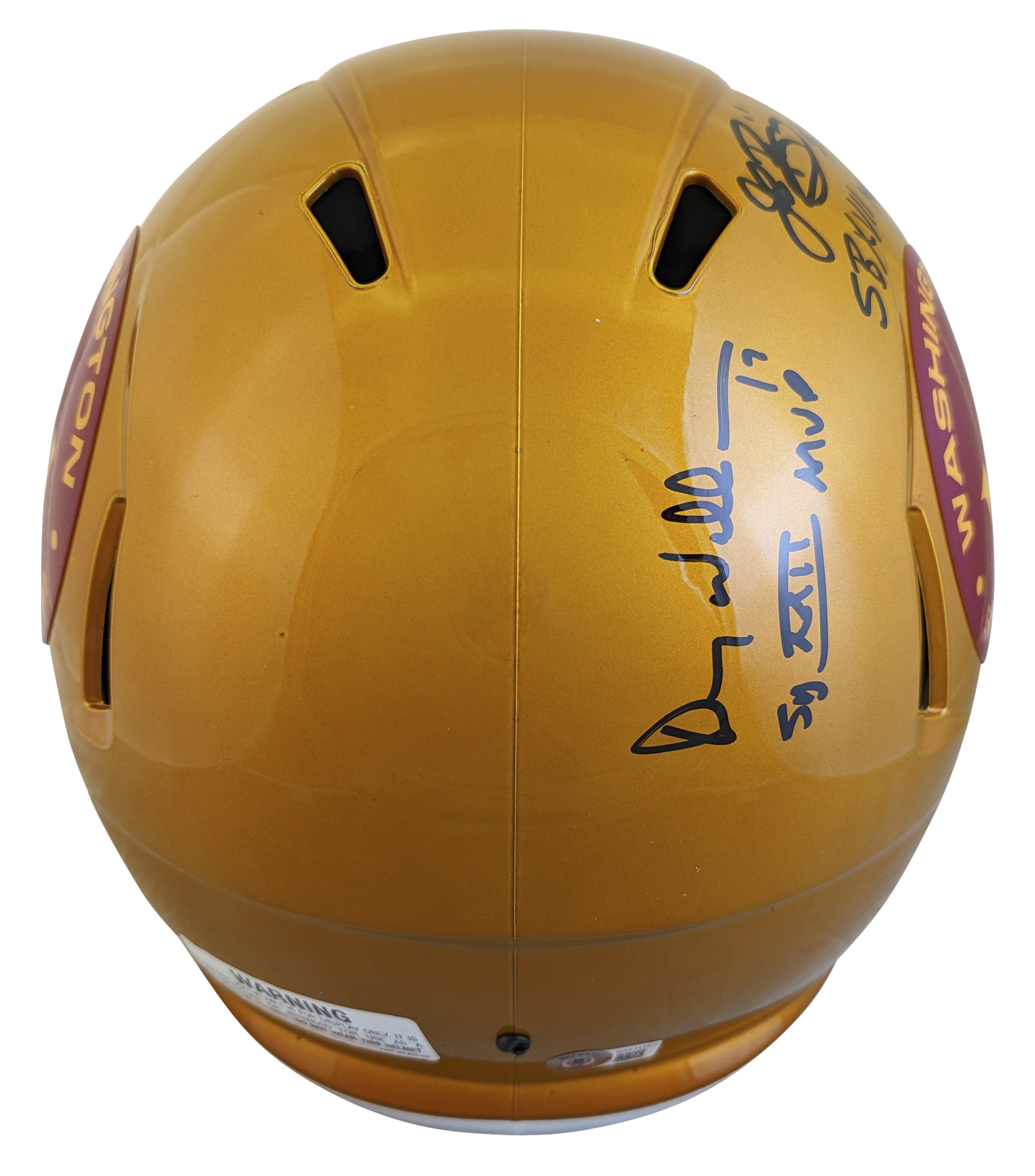This Autographed Alternate Flash Riddell Full Size Speed Rep Helmet with the inscription of "SB XVII MVP (Riggins), SB XXII MVP (Williams), SB XXVI MVP (Rypien)" has been Personally Signed by Doug Williams, Mark Rypien & John Riggins of the Washington Football Team. This item is 100% Authentic to include a hologram by Beckett Authentication Services. This item may come with the new Beckett Authentication hologram that has a scannable QR code rather than the traditional COA. If you would like to have a COA, you are welcome to reach out to Beckett for a printed certification once you receive your item. This is a BAS Witnessed Protection Program item which means a Beckett Authentication Service representative was present when this item was being signed. We conducted an autograph signing with Doug Williams, Mark Rypien & John Riggins where multiples of the same item were signed. While the photographs are representative of this item, the size, placement and strength of the signature may vary. Each item is hand signed, therefore, each autograph is unique. This item can be verified through BAS Witnessed.