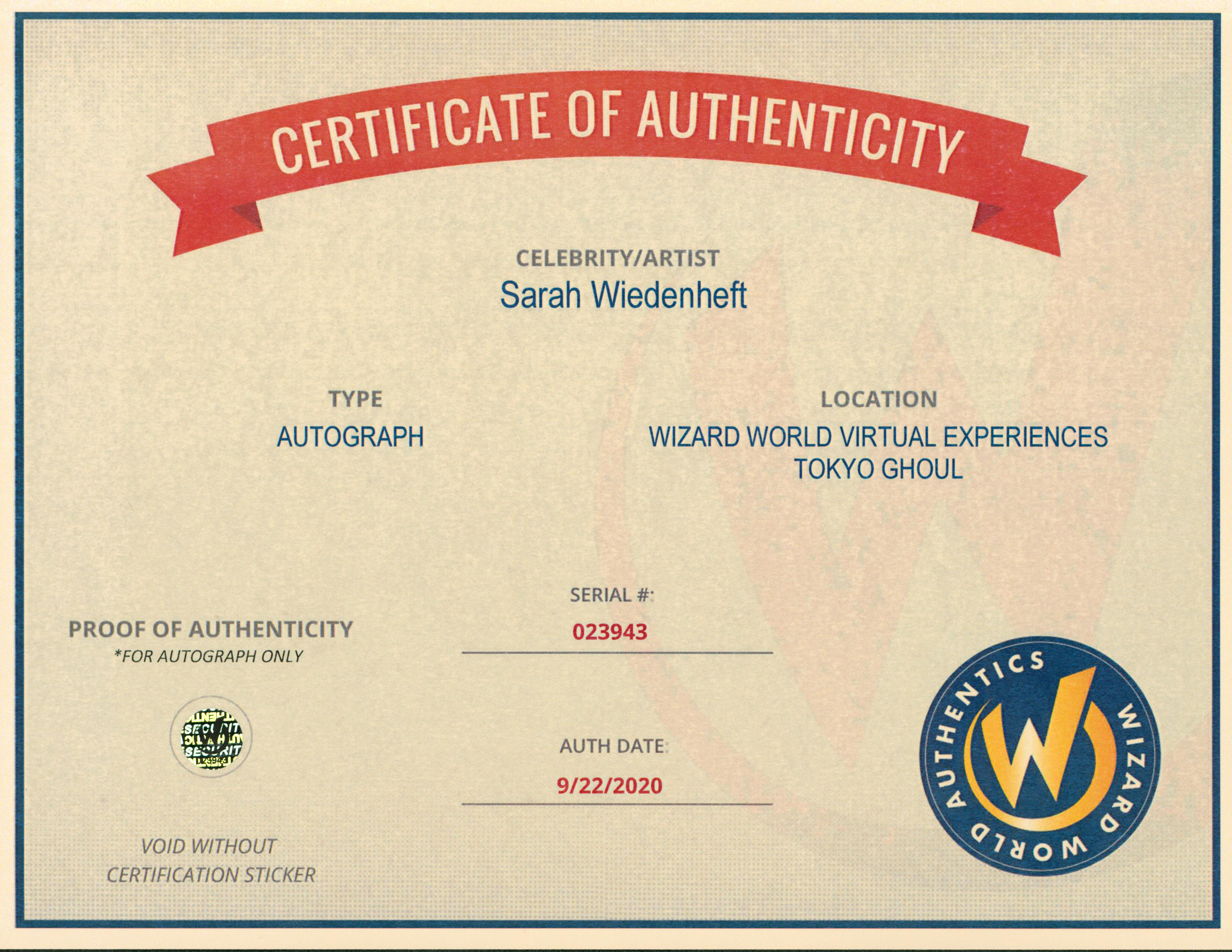This Autographed 8x10 Photo has been Personally Signed by Sarah Wiedenheft of Tokyo Ghoul. This item is 100% Authentic to include a Certificate of Authenticity (COA) / hologram by Wizard World Authentics. A Wizard World Authentics representative was present when this item was being signed, the date of the signing is notated on the COA. We have multiples of this same item. While the photographs are representative of this item, the size, placement and strength of the signature may vary. Each item is hand signed, therefore, each autograph is unique.