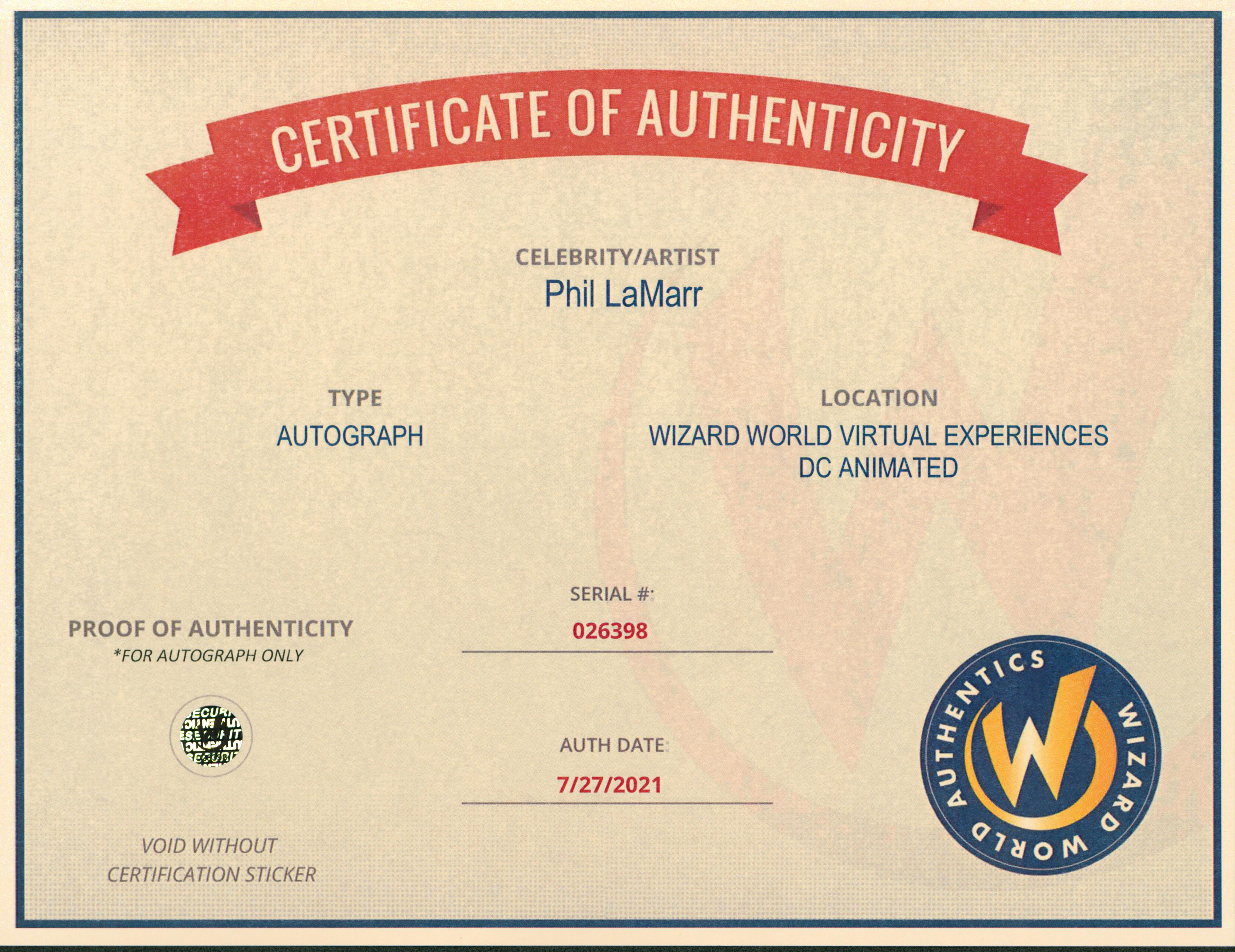 This Autographed 8x10 Photo has been Personally Signed by Phil LaMarr of Family Guy. This item is 100% Authentic to include a Certificate of Authenticity (COA) / hologram by Wizard World Authentics. A Wizard World Authentics representative was present when this item was being signed, the date of the signing is notated on the COA. We have multiples of this same item. While the photographs are representative of this item, the size, placement and strength of the signature may vary. Each item is hand signed, therefore, each autograph is unique.