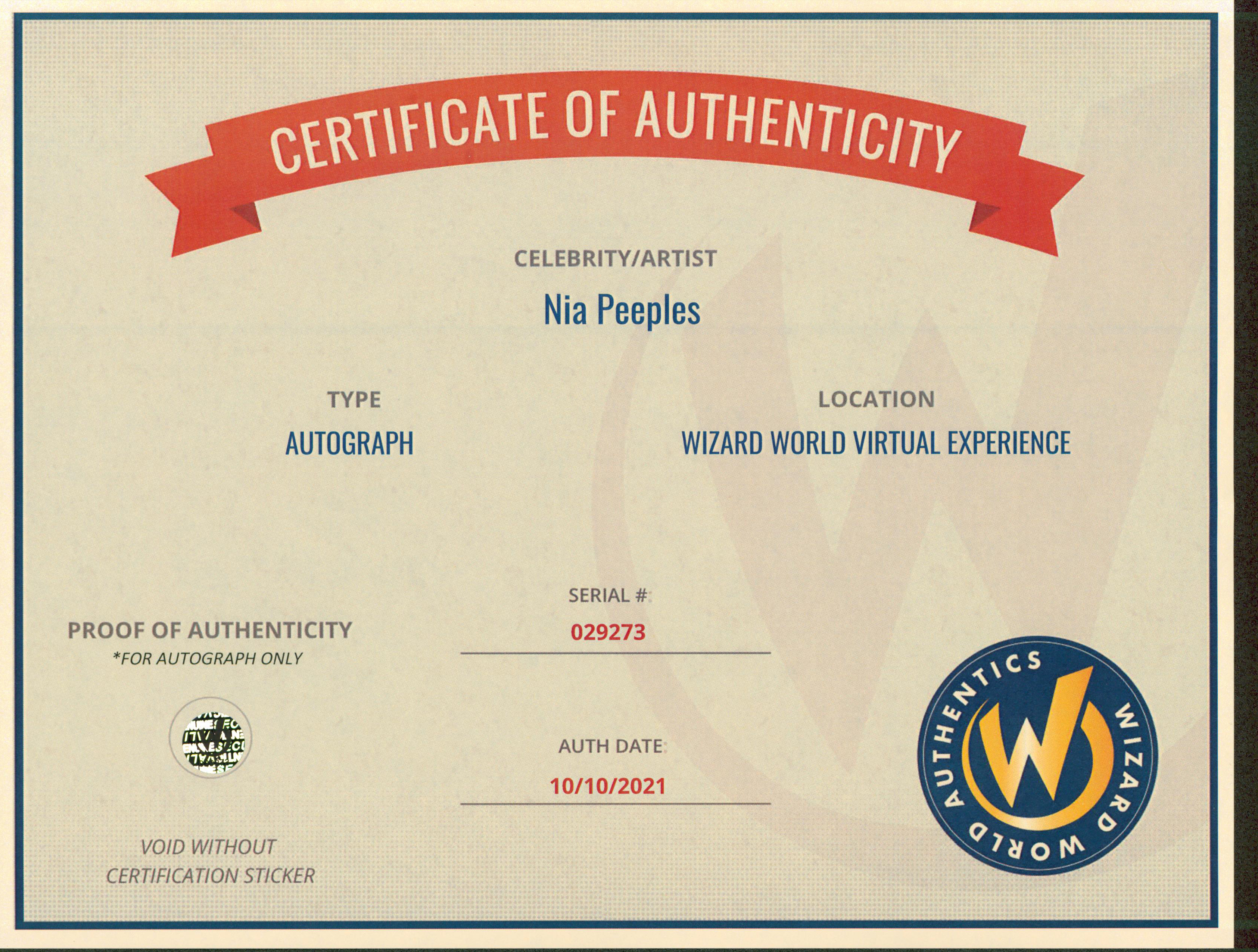 This Autographed 8x10 Photo has been Personally Signed by Nia Peeples of Pretty Little Liars. This item is 100% Authentic to include a Certificate of Authenticity (COA) / hologram by Wizard World Authentics. A Wizard World Authentics representative was present when this item was being signed, the date of the signing is notated on the COA. We have multiples of this same item. While the photographs are representative of this item, the size, placement and strength of the signature may vary. Each item is hand signed, therefore, each autograph is unique.