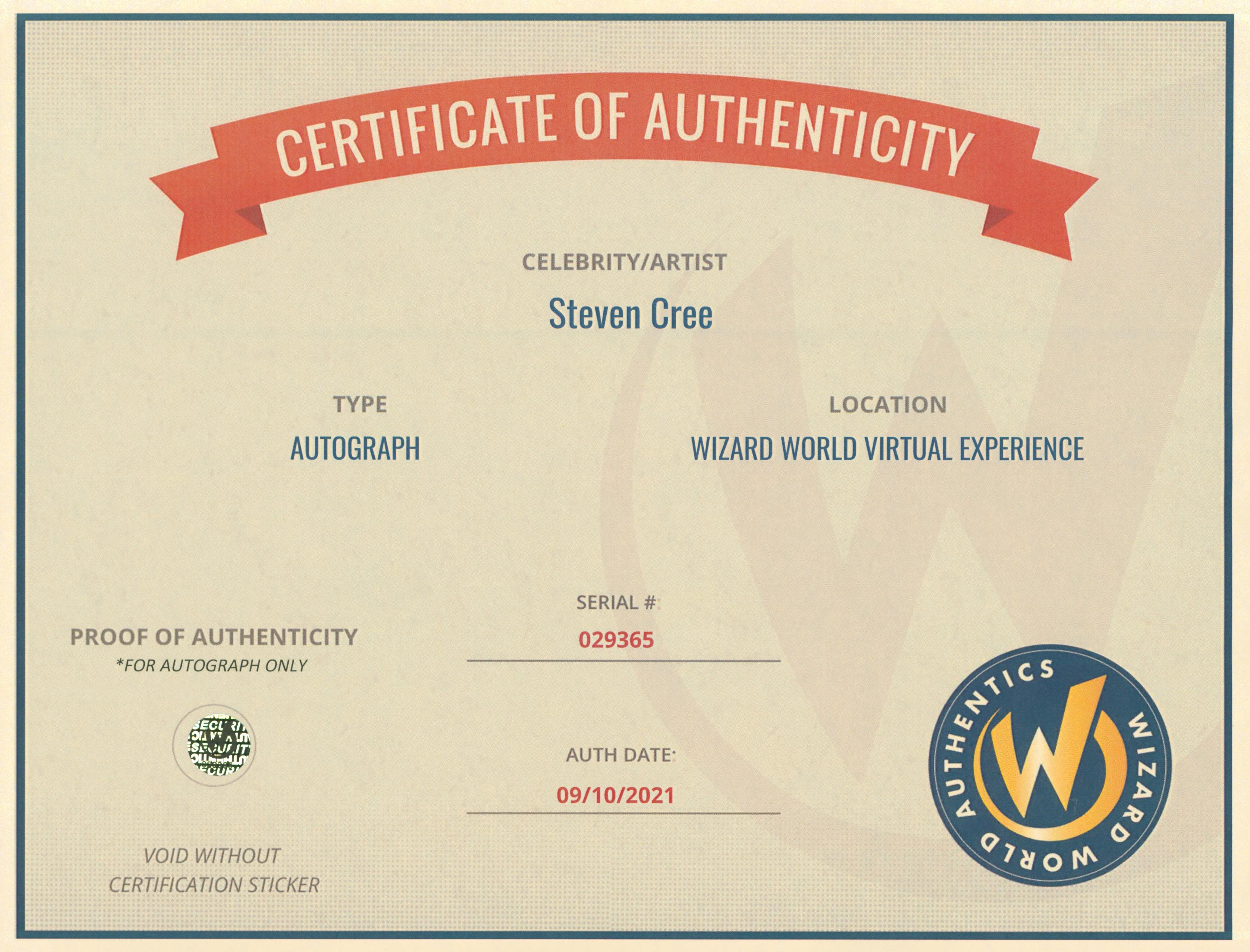 This Autographed 8x10 Photo has been Personally Signed by Steven Cree of Outlander. This item is 100% Authentic to include a Certificate of Authenticity (COA) / hologram by Wizard World Authentics. A Wizard World Authentics representative was present when this item was being signed, the date of the signing is notated on the COA. We have multiples of this same item. While the photographs are representative of this item, the size, placement and strength of the signature may vary. Each item is hand signed, therefore, each autograph is unique.
