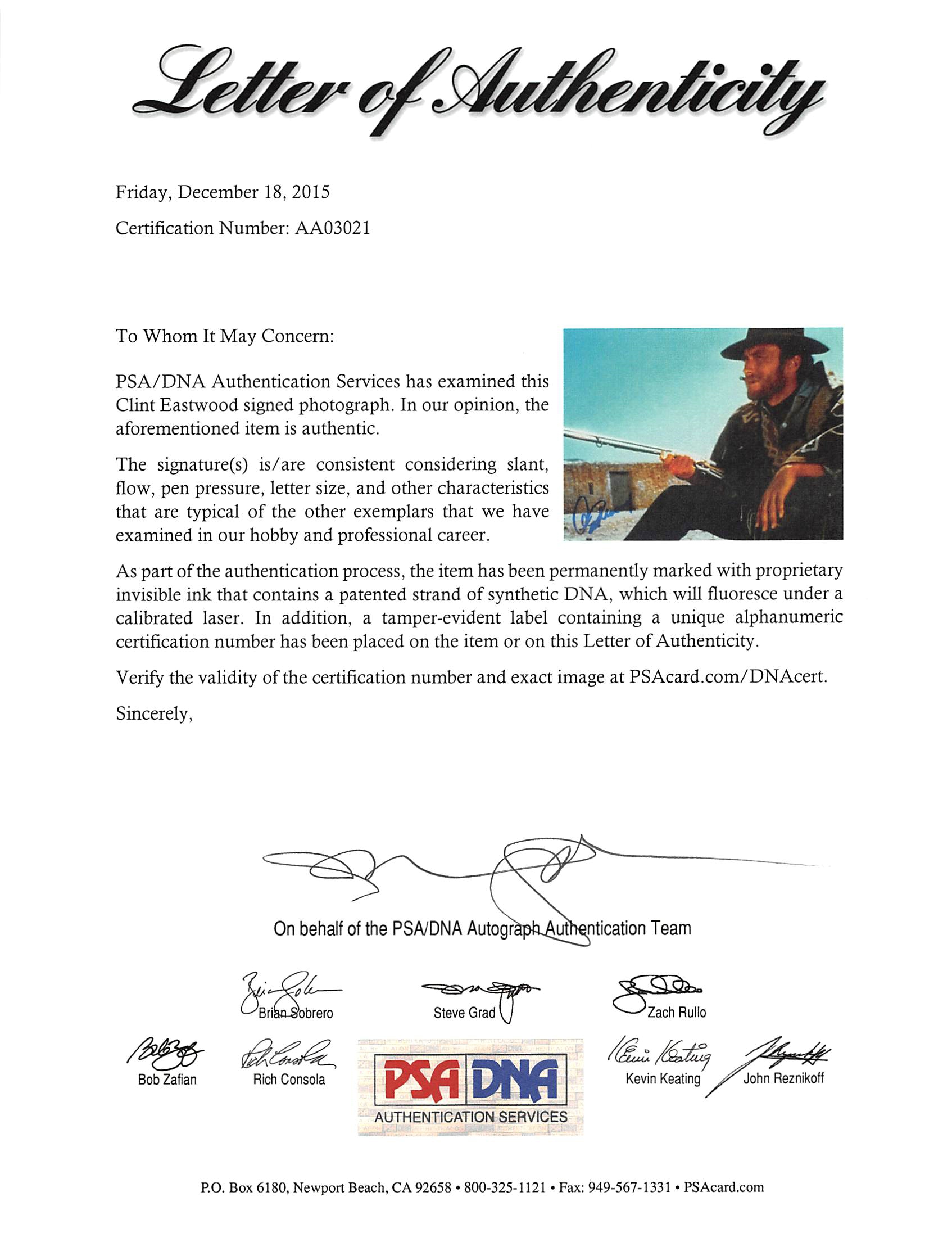 This Autographed 8x10 Photo has been Personally Signed by Clint Eastwood of The Good, the Bad and the Ugly. This item is 100% Authentic and comes with a PSA/DNA Certification Card and a matching numbered Hologram. The authenticity can be verified on Professional Sports Authenticator website.