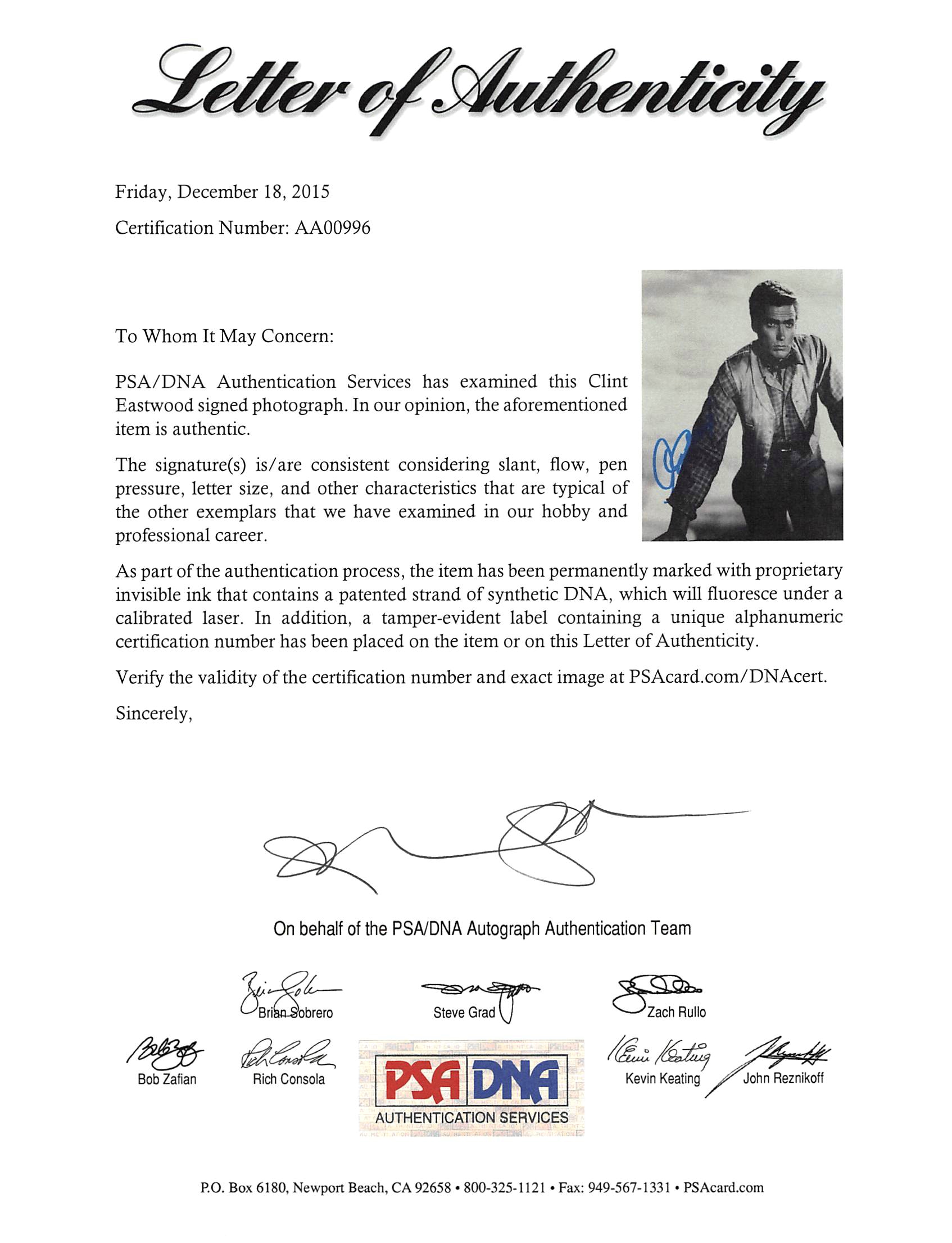 This Autographed 8x10 Photo has been Personally Signed by Clint Eastwood of Rawhide. This item is 100% Authentic and comes with a PSA/DNA Certification Card and a matching numbered Hologram. The authenticity can be verified on Professional Sports Authenticator website.