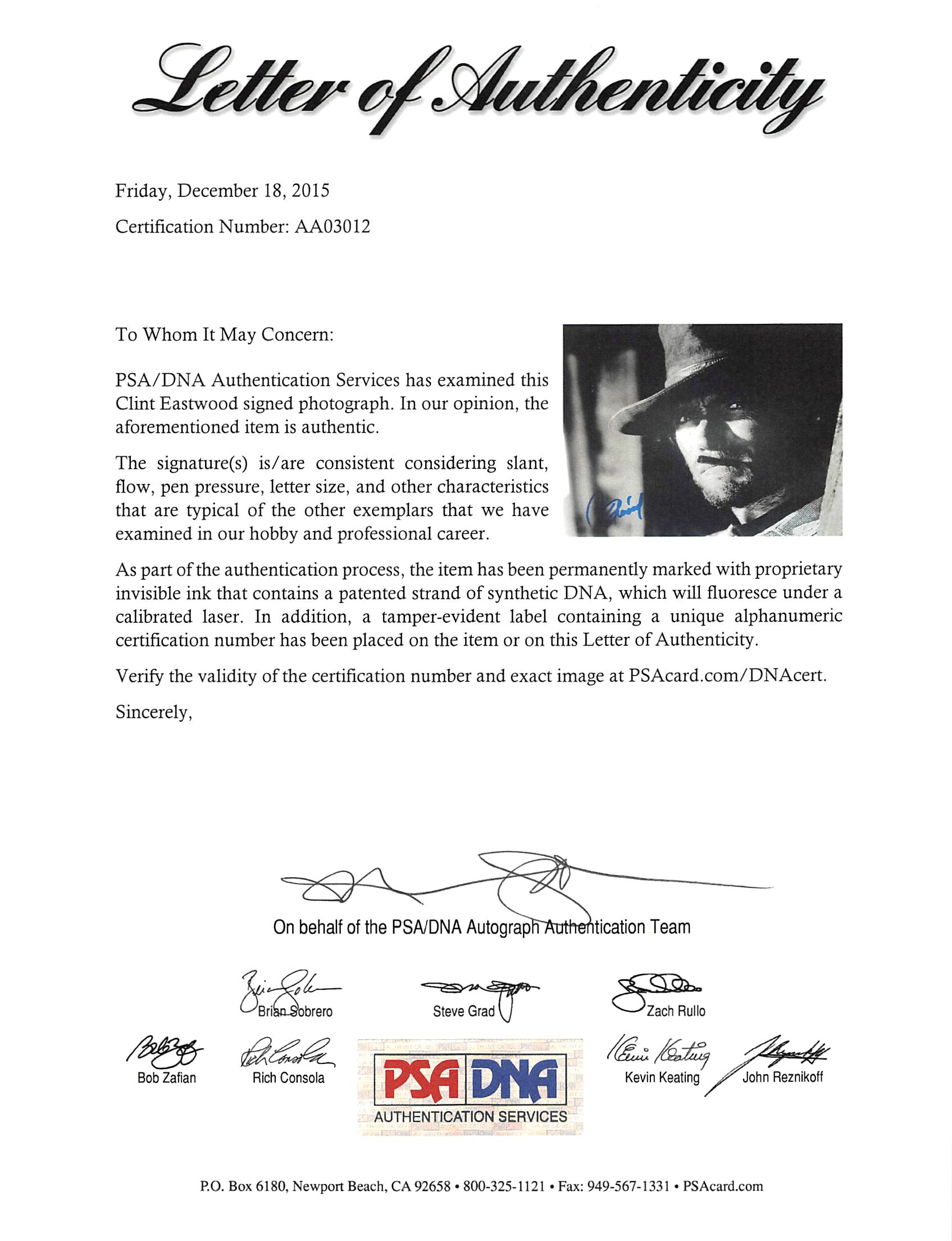 This Autographed 8x10 Photo has been Personally Signed by Clint Eastwood of The Good, the Bad and the Ugly. This item is 100% Authentic and comes with a PSA/DNA Certification Card and a matching numbered Hologram. The authenticity can be verified on Professional Sports Authenticator website.