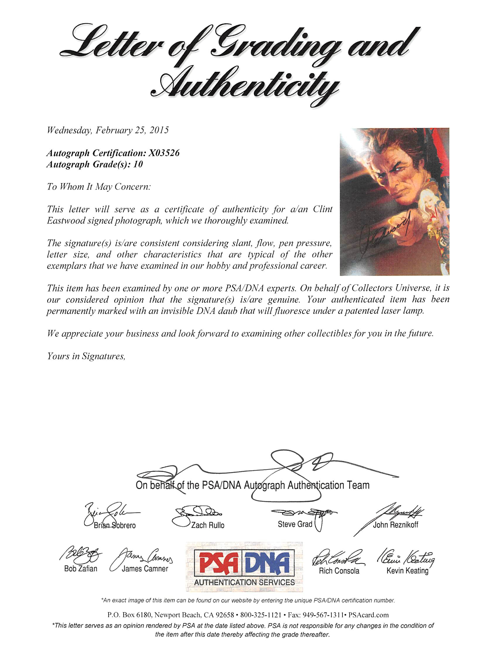 This Autographed Auto Graded Gem Mint 10! 8x10 Photo has been Personally Signed by Clint Eastwood of Any Which Way You Can. This item is 100% Authentic and comes with a PSA/DNA Certification Card and a matching numbered Hologram. The authenticity can be verified on Professional Sports Authenticator website.