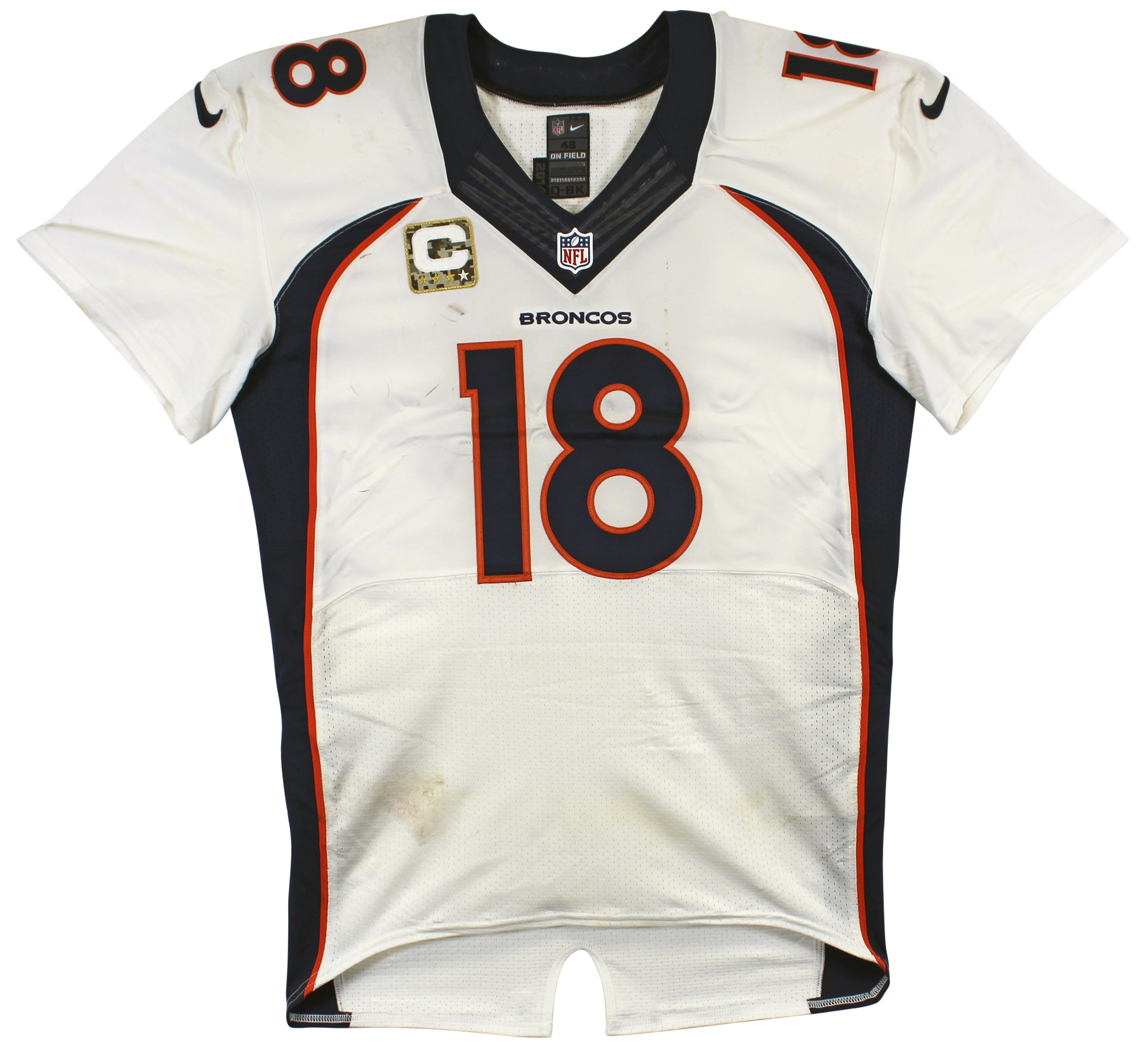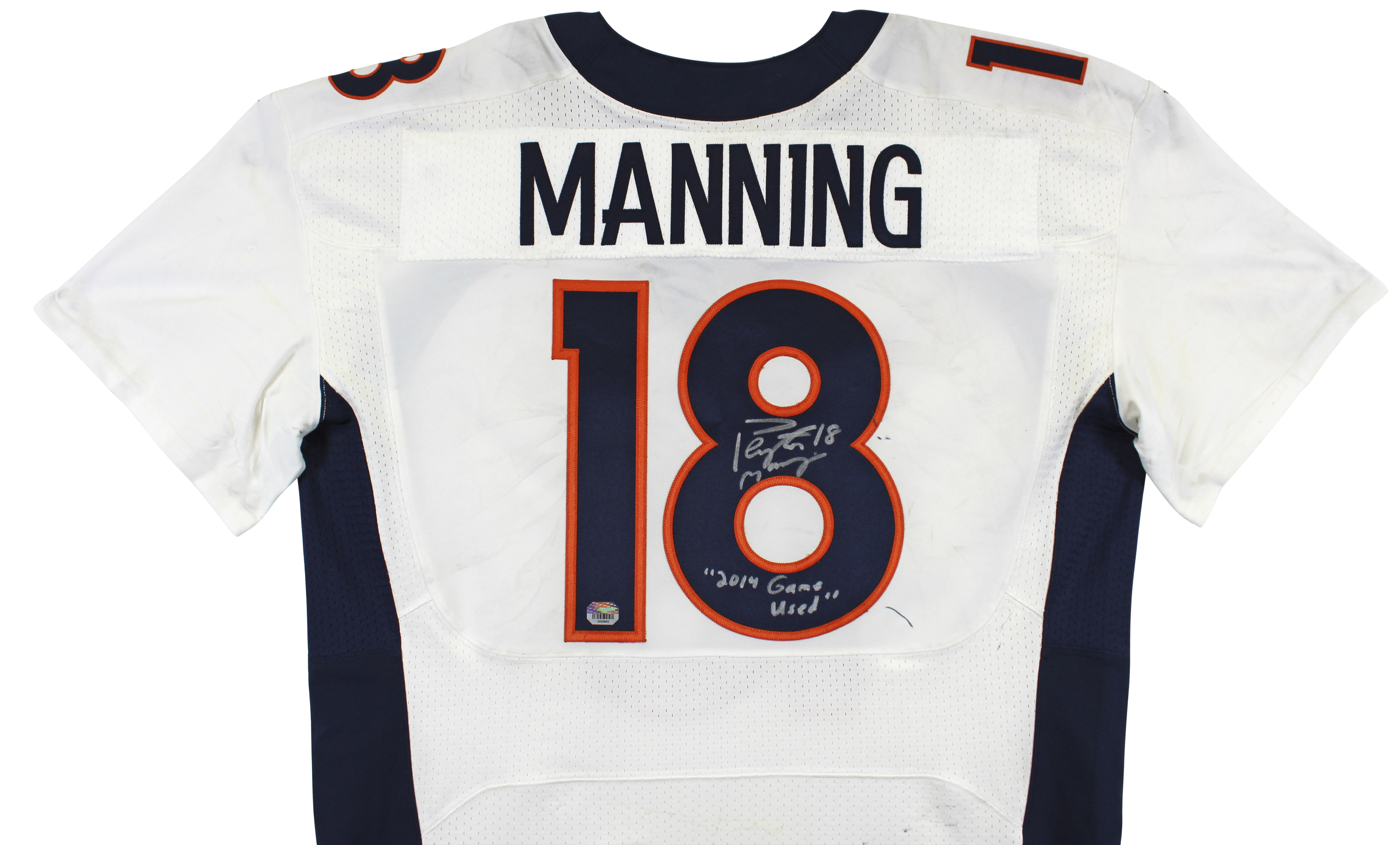 This Autographed White Nike Jersey with the inscription of "2014 Game Used" has been Personally Signed by Peyton Manning of the Denver Broncos. This item is 100% Authentic to includes a numbered hologram by Fanatics. The authenticity can be verified on Fanatics website.