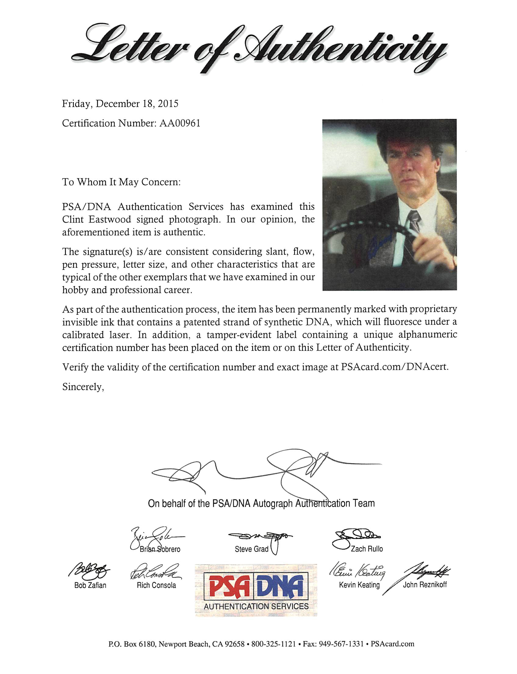 This Autographed 8x10 Photo has been Personally Signed by Clint Eastwood of Dirty Harry. This item is 100% Authentic and comes with a PSA/DNA Certification Card and a matching numbered Hologram. The authenticity can be verified on Professional Sports Authenticator website.