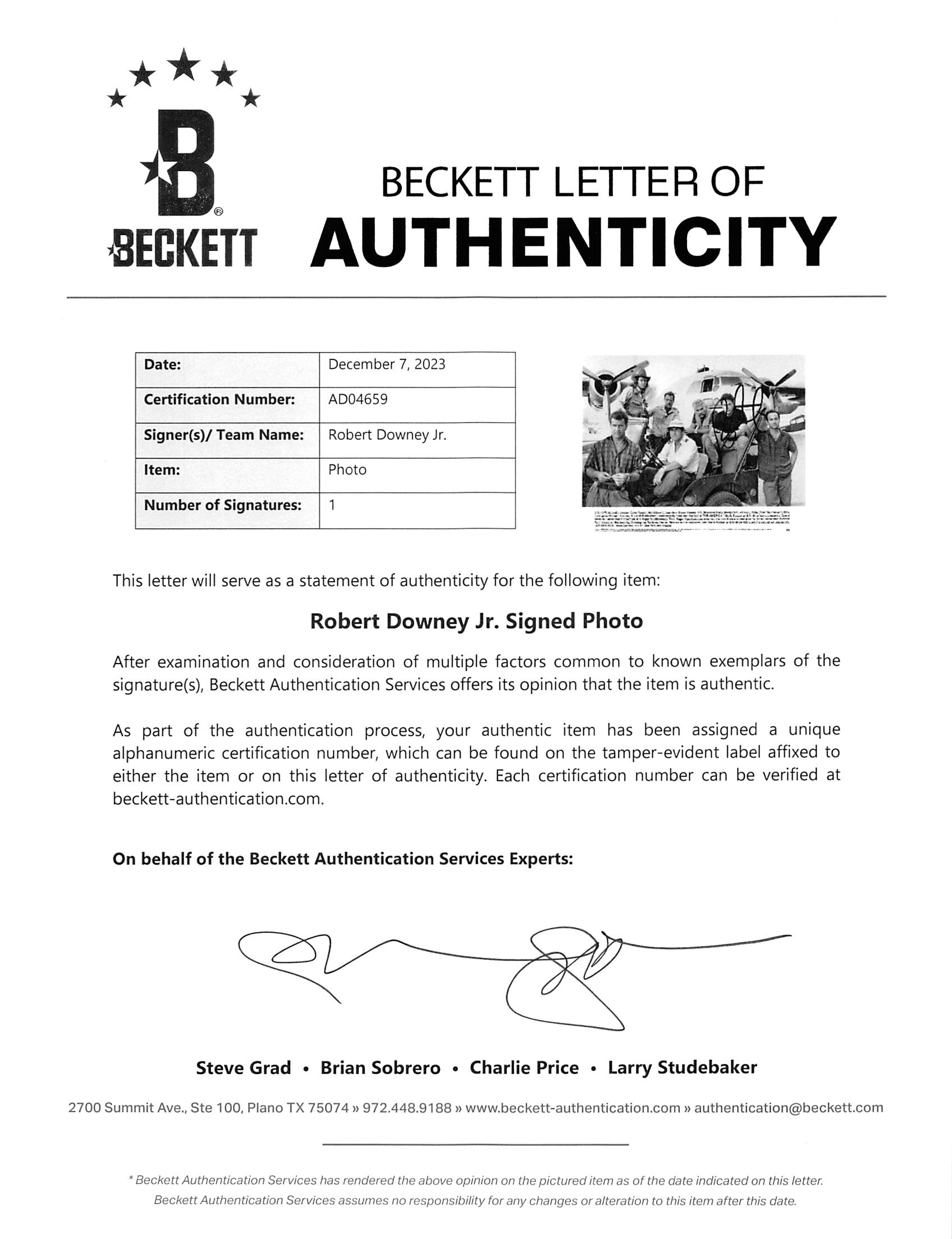 This Autographed Black & White Promotional 8x10 Photo has been Personally Signed by Robert Downey Jr. of Air America. This item is 100% Authentic to include a Certificate of Authenticity (COA) / hologram by Beckett Authentication Services. The authenticity can be verified on Beckett Authentication Services website.