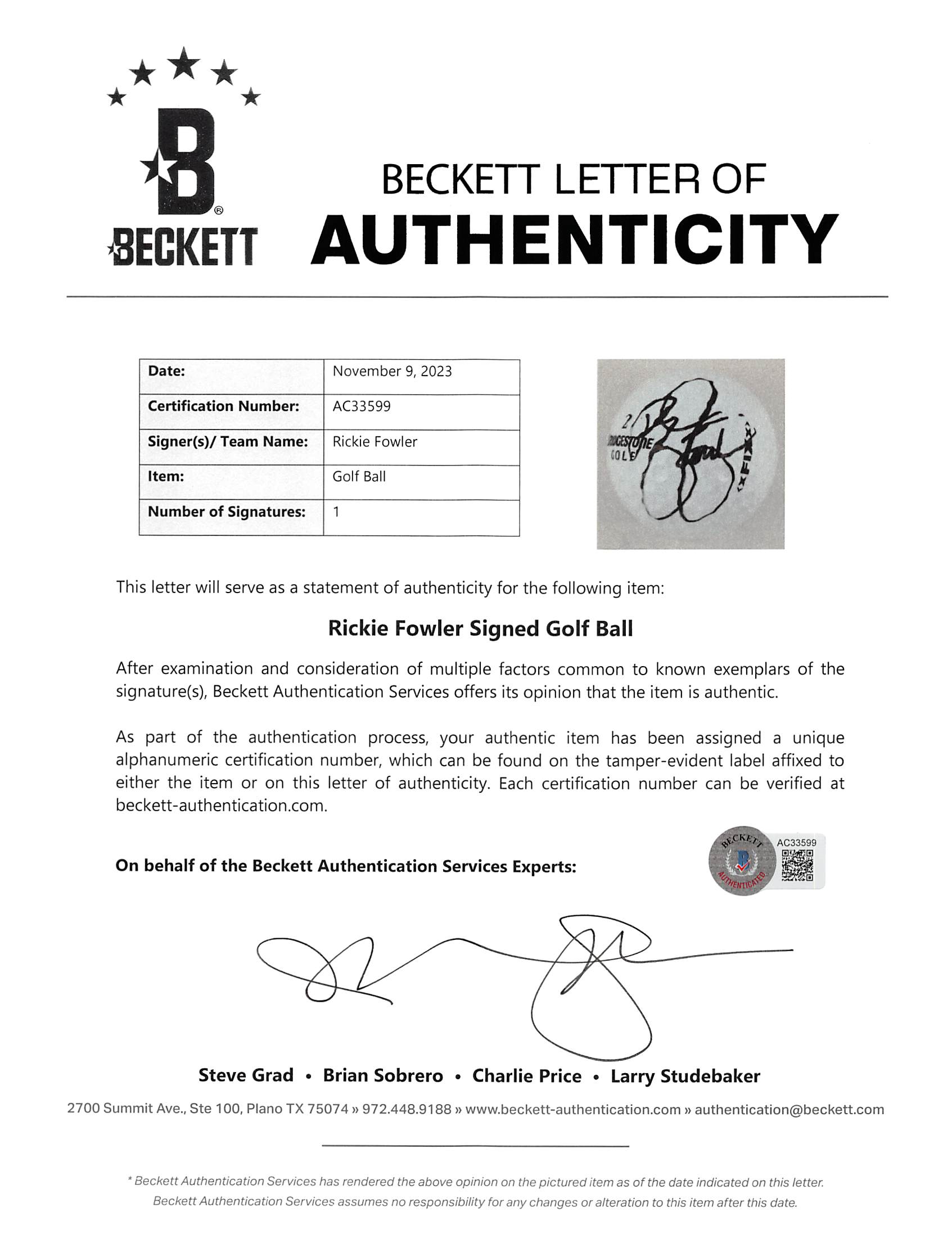 This Autographed Waste Management Open Logo Bridgestone Golf Ball has been Personally Signed by Rickie Fowler. This item is 100% Authentic to include a Certificate of Authenticity (COA) / hologram by Beckett Authentication Services. The authenticity can be verified on Beckett Authentication Services website.