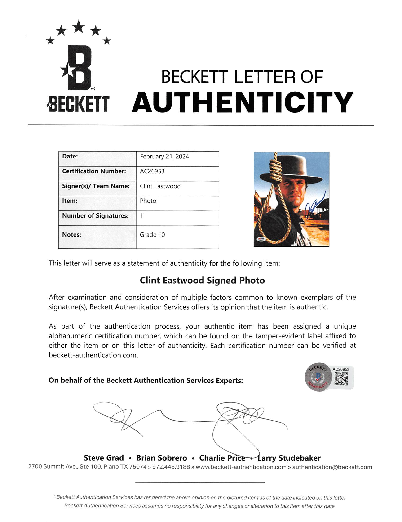 This Autographed Auto Graded Gem Mint 10! 8x10 Photo has been Personally Signed by Clint Eastwood of The Good, the Bad and the Ugly. This item is 100% Authentic to include a hologram by Beckett Authentication Services. This item will come with an affixed Beckett Authentication Services (BAS) authentication sticker, which includes a scannable QR code to verify authenticity. Please note that Beckett no longer provides serial-numbered COA cards, and the attached BAS sticker will serve as the complete authentication for this item. The authenticity can be verified on Beckett Authentication Services website. This photo has also been authenticated by PSA. It will include its PSA Letter of Authenticity as well, which is not scanned or added to the listing, because this photo was not added to PSA's database, so we had Beckett authenticate this photo as well.