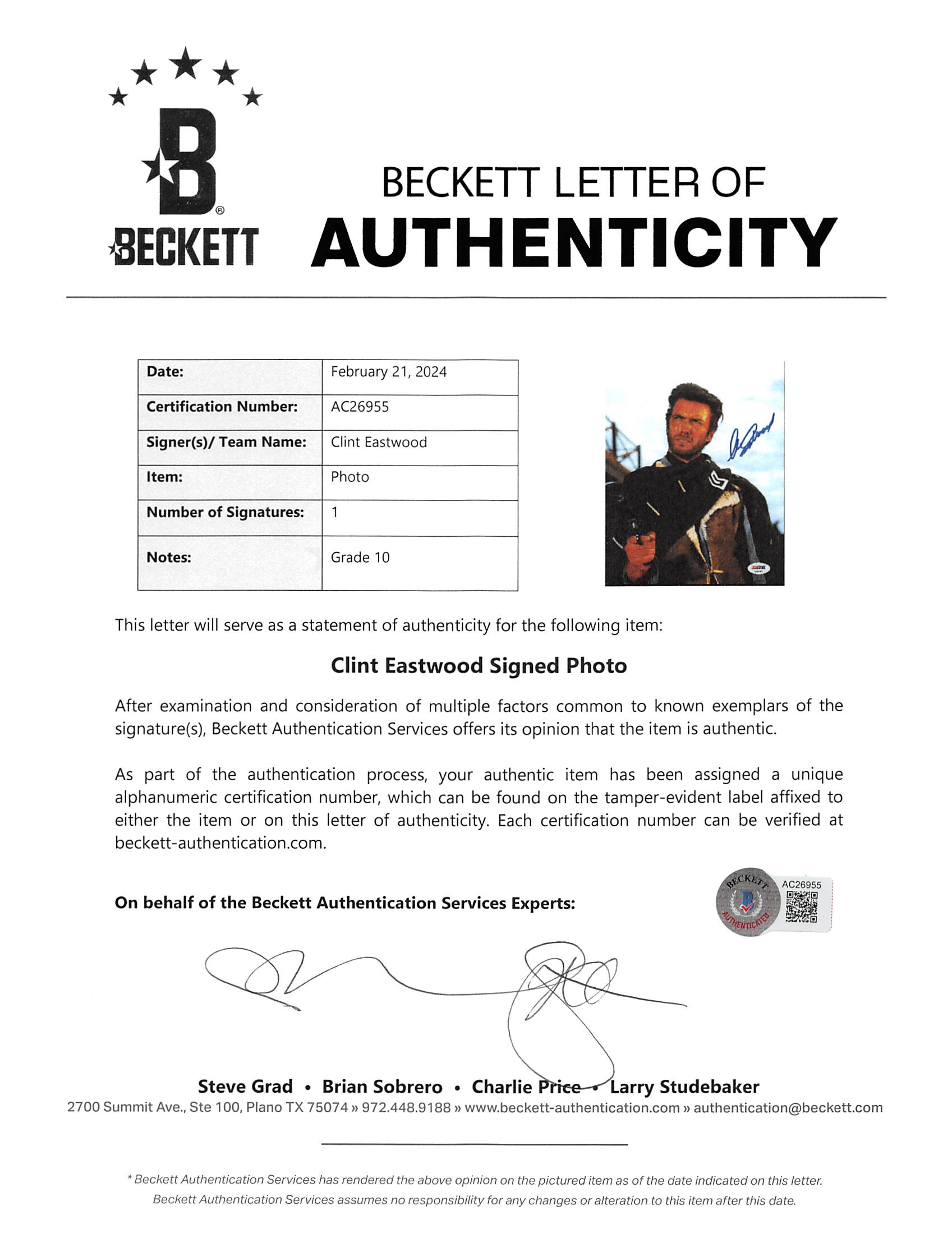 This Autographed Auto Graded Gem Mint 10! 8x10 Photo has been Personally Signed by Clint Eastwood of The Good, the Bad and the Ugly. This item is 100% Authentic to include a hologram by Beckett Authentication Services. This item will come with an affixed Beckett Authentication Services (BAS) authentication sticker, which includes a scannable QR code to verify authenticity. Please note that Beckett no longer provides serial-numbered COA cards, and the attached BAS sticker will serve as the complete authentication for this item. The authenticity can be verified on Beckett Authentication Services website. This photo has also been authenticated by PSA. It will include its PSA Letter of Authenticity as well, which is not scanned or added to the listing, because this photo was not added to PSA's database, so we had Beckett authenticate this photo as well.
