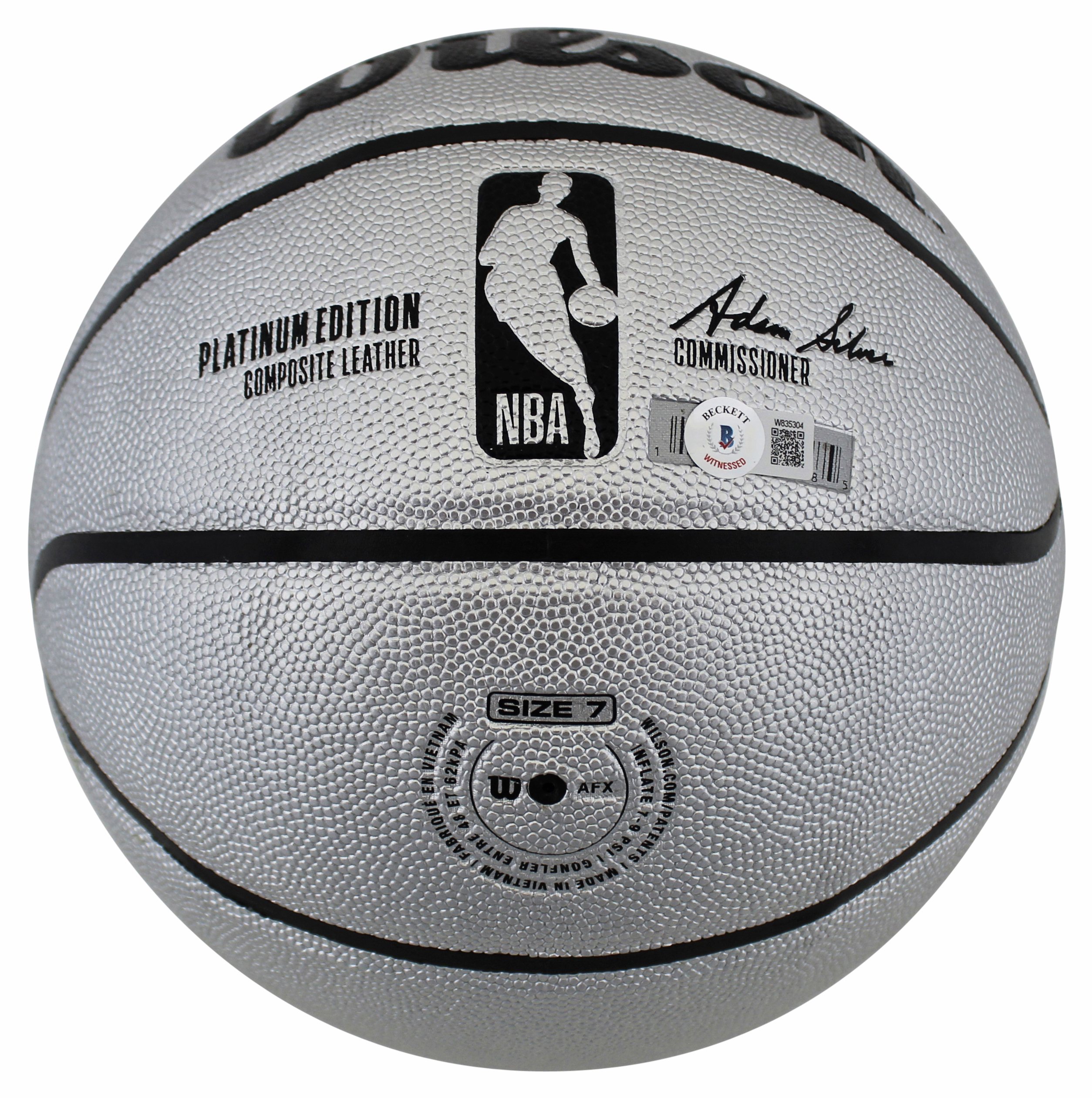 This Autographed Silver Wilson Indoor/Outdoor Basketball has been Personally Signed by Magic Johnson & Larry Bird. This item is 100% Authentic to include a hologram by Beckett Authentication Services. This item will come with an affixed Beckett Authentication Services (BAS) authentication sticker, which includes a scannable QR code to verify authenticity. Please note that Beckett no longer provides serial-numbered COA cards, and the attached BAS sticker will serve as the complete authentication for this item. This is a BAS Witnessed Protection Program item which means a Beckett Authentication Service representative was present when this item was being signed. We conducted an autograph signing with Magic Johnson & Larry Bird where multiples of the same item were signed. While the photographs are representative of this item, the size, placement and strength of the signature may vary. Each item is hand signed, therefore, each autograph is unique. This item can be verified through BAS Witnessed.